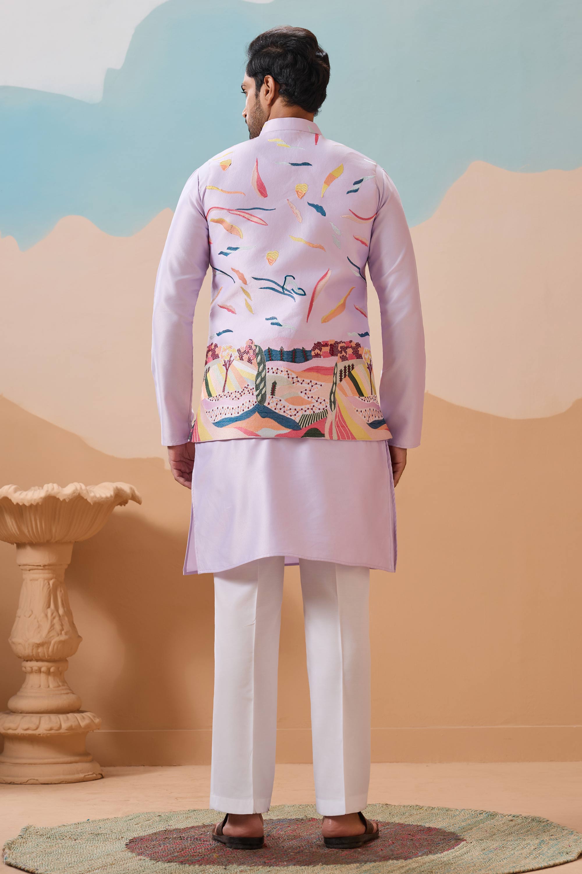 Mens Readymade Kurta Pyjama with Jacket Celebrate in style with this complete traditional outfit designed to add charm to any festive gathering. This ready to wear ensemble features a soft, high quality fabric that feels light yet looks striking. The stylish jacket adds the finishing touch to a timeless look suitable for weddings, receptions, or cultural events. Tailored with care, this outfit provides both comfort and sophistication without compromising on style. Perfect for those seeking effortless elegance and a sleek, put together look for all kinds of special occasions.