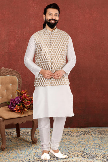 Dhupion Silk White Magnificent Readymade Men Kurta Pyjama With Jacket