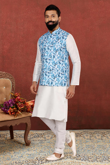 Dhupion Silk White Reception Wear Attractive Readymade Men Kurta Pyjama With Jacket
