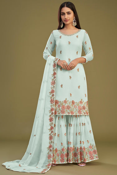 Embroidered Light Cyan Color Georgette Fabric Function Wear Palazzo Suit