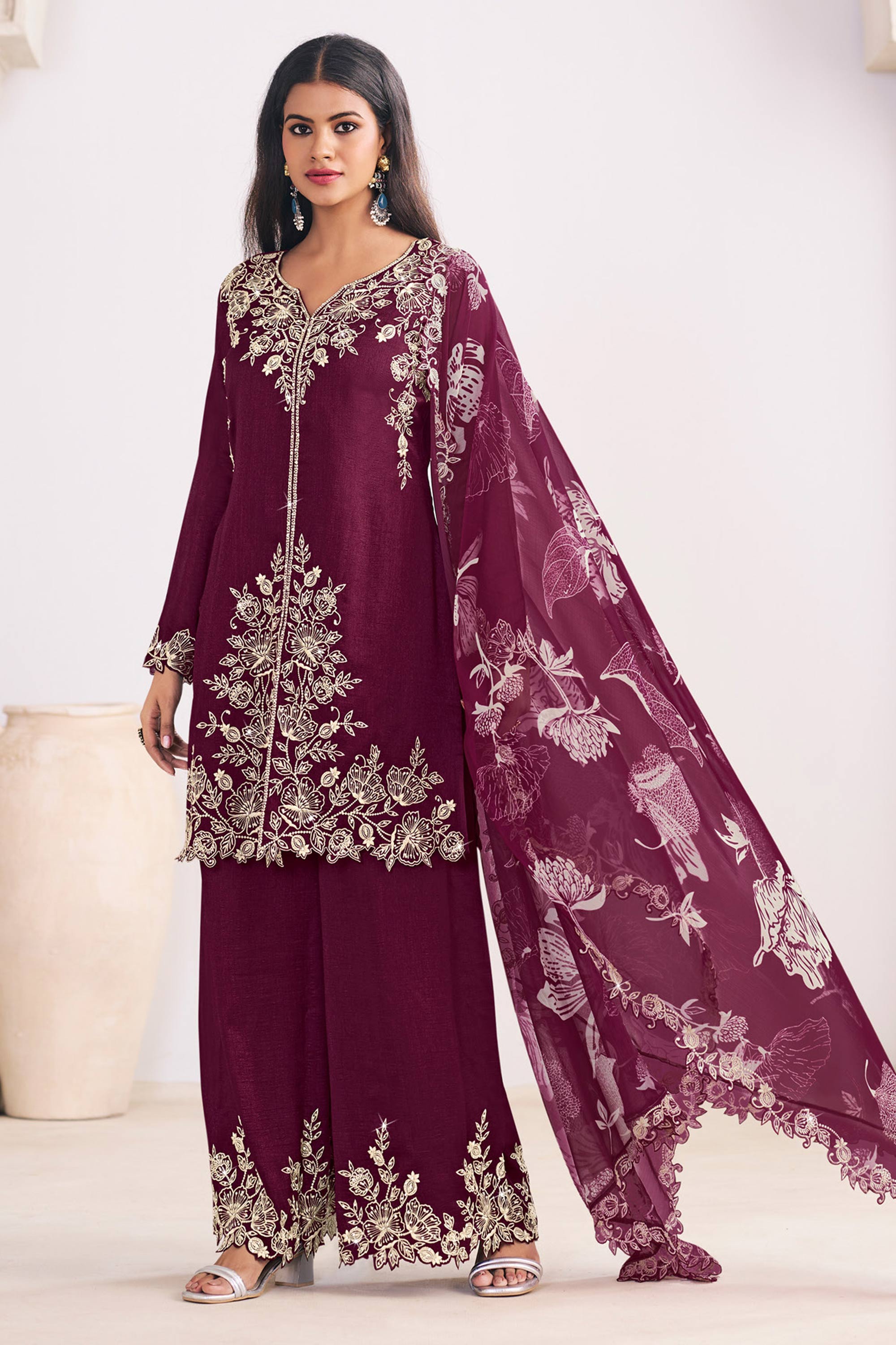 Womens Burgundy Embroidered Art Silk Readymade Palazzo Suit With Dupatta