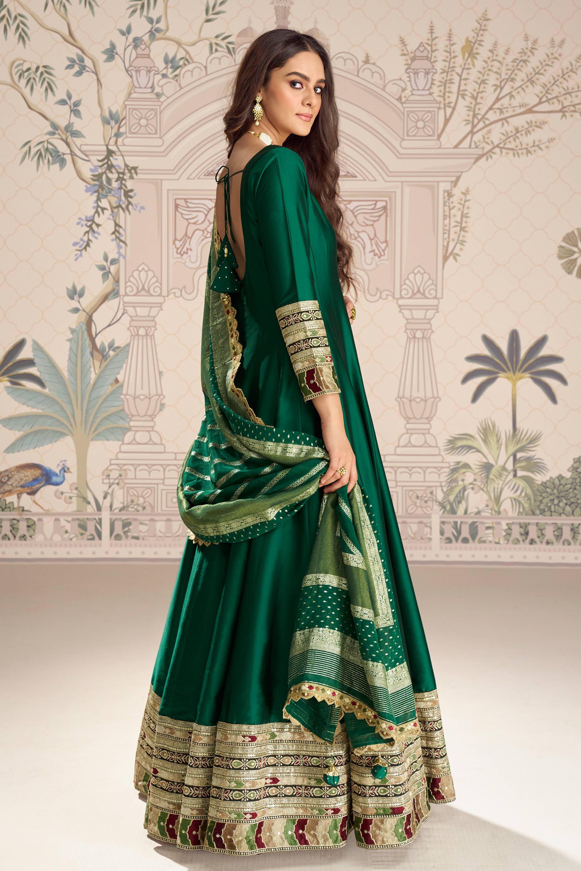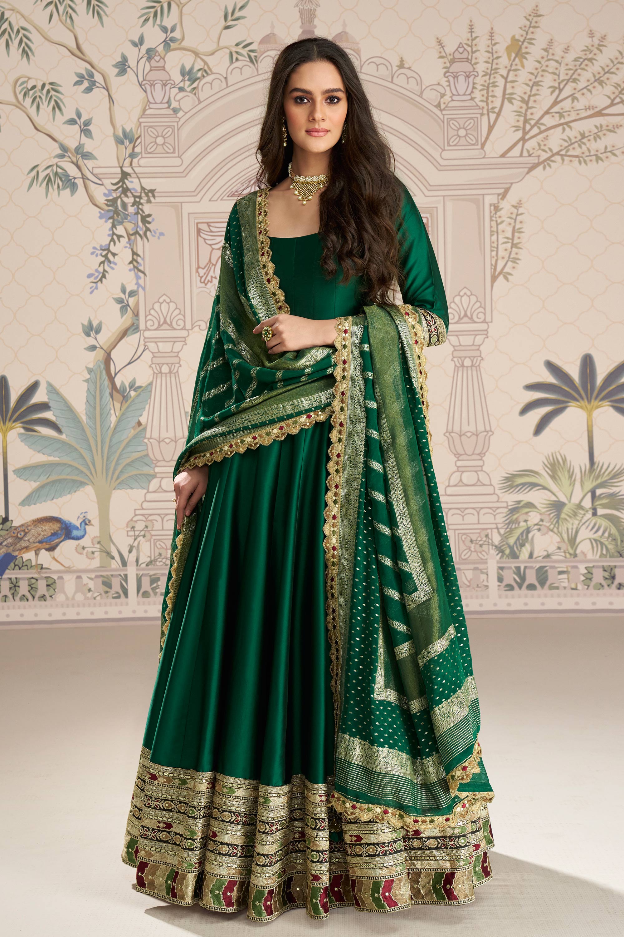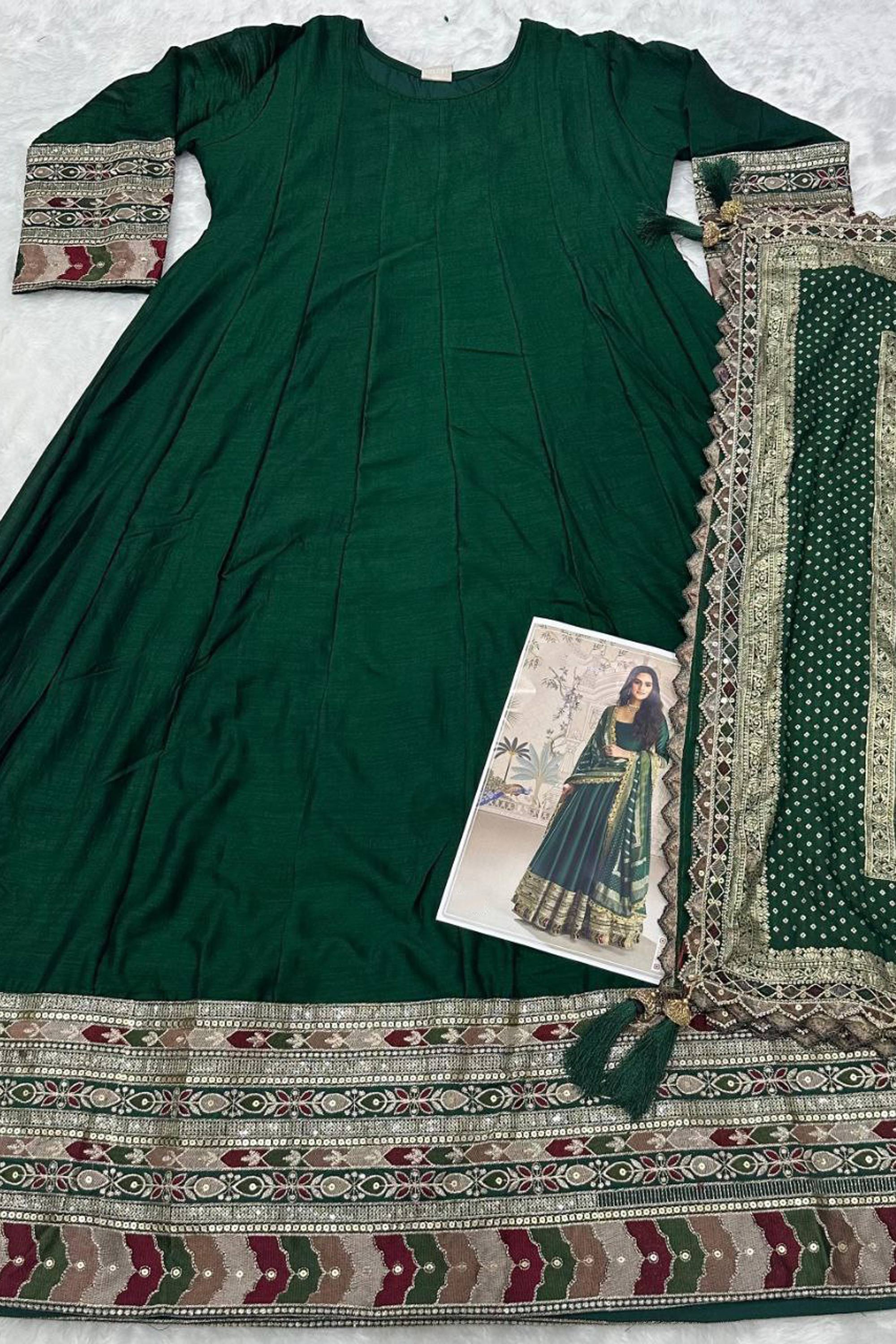 Dark Green Embroidered Art Silk Function Wear Gown With Dupatta