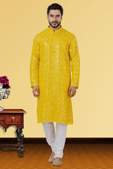 Georgette Fabric Readymade Men Kurta Pyjama In Yellow Color
