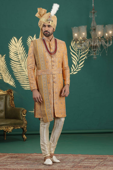 Yellow Banarasi Jacquard Wedding Wear Trendy Readymade Sherwani For Men With Stole