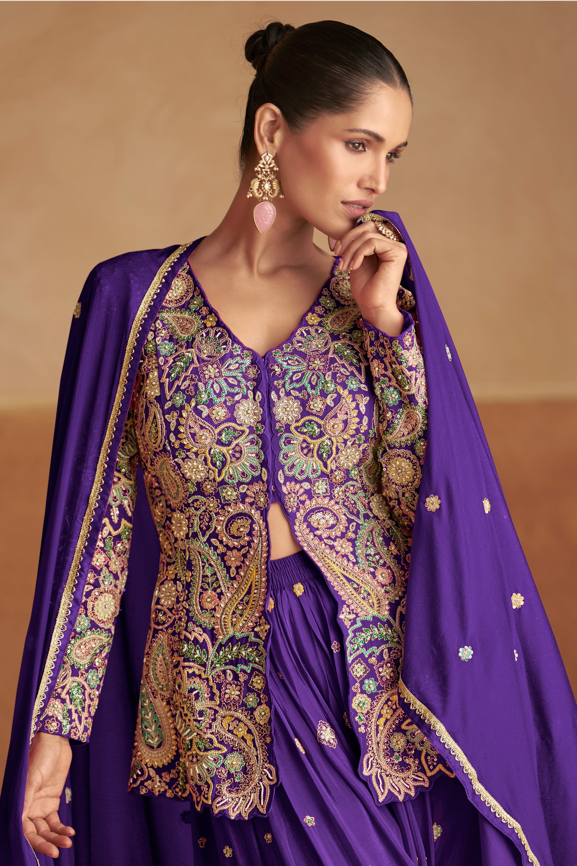 Chinon Purple Embroidered Readymade Indo Western Top With Palazzo