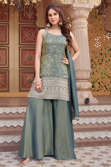 Elevate your ethnic wardrobe with this Grey Silk Indo Western Palazzo Set. Made from premium silk fabric, it features intricate embroidery that adds a touch of elegance to your look. The comfortable palazzo pants are paired with a stylish long top, making it perfect for festive occasions, weddings, or special events. The subtle grey color enhances the rich texture, while the contemporary design keeps it chic and modern. With a relaxed fit and superior stitching, this set promises comfort without compromising on style. Pair it with your favorite jewelry and sandals to complete the ensemble. Available in various sizes.
