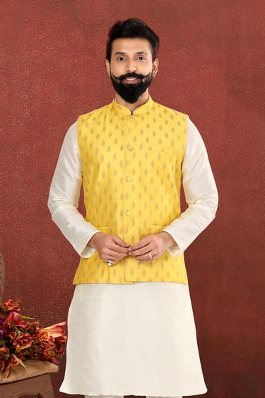 Cotton Silk Fabric Yellow Color Wedding Wear Readymade Designer Men Jacket