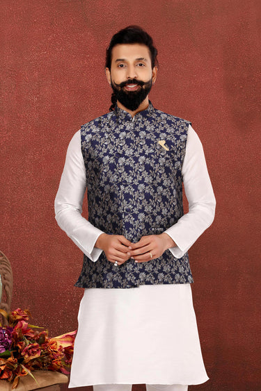 Navy Blue Gorgeous Jacquard Silk Fabric Wedding Wear Readymade Jacket For Men