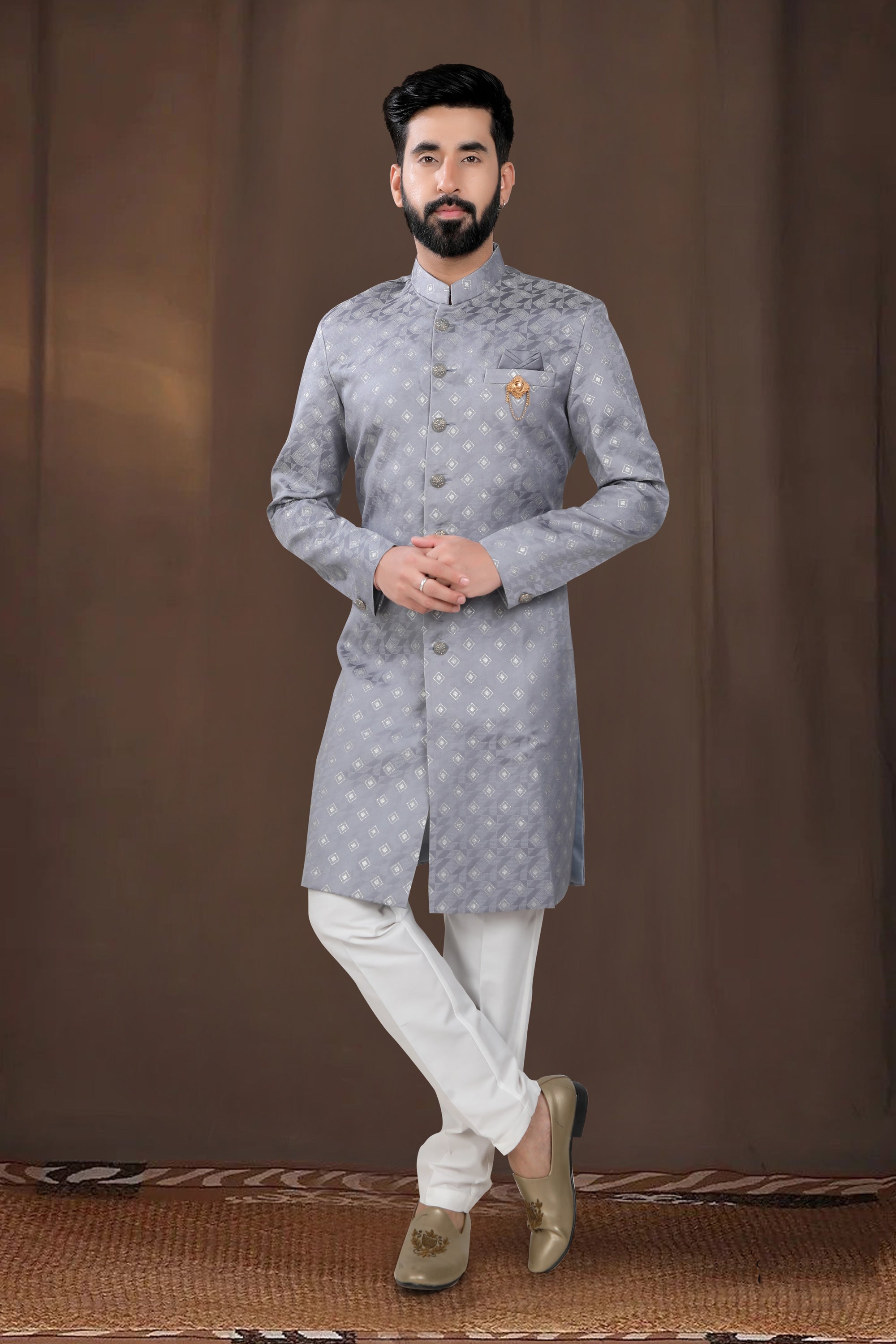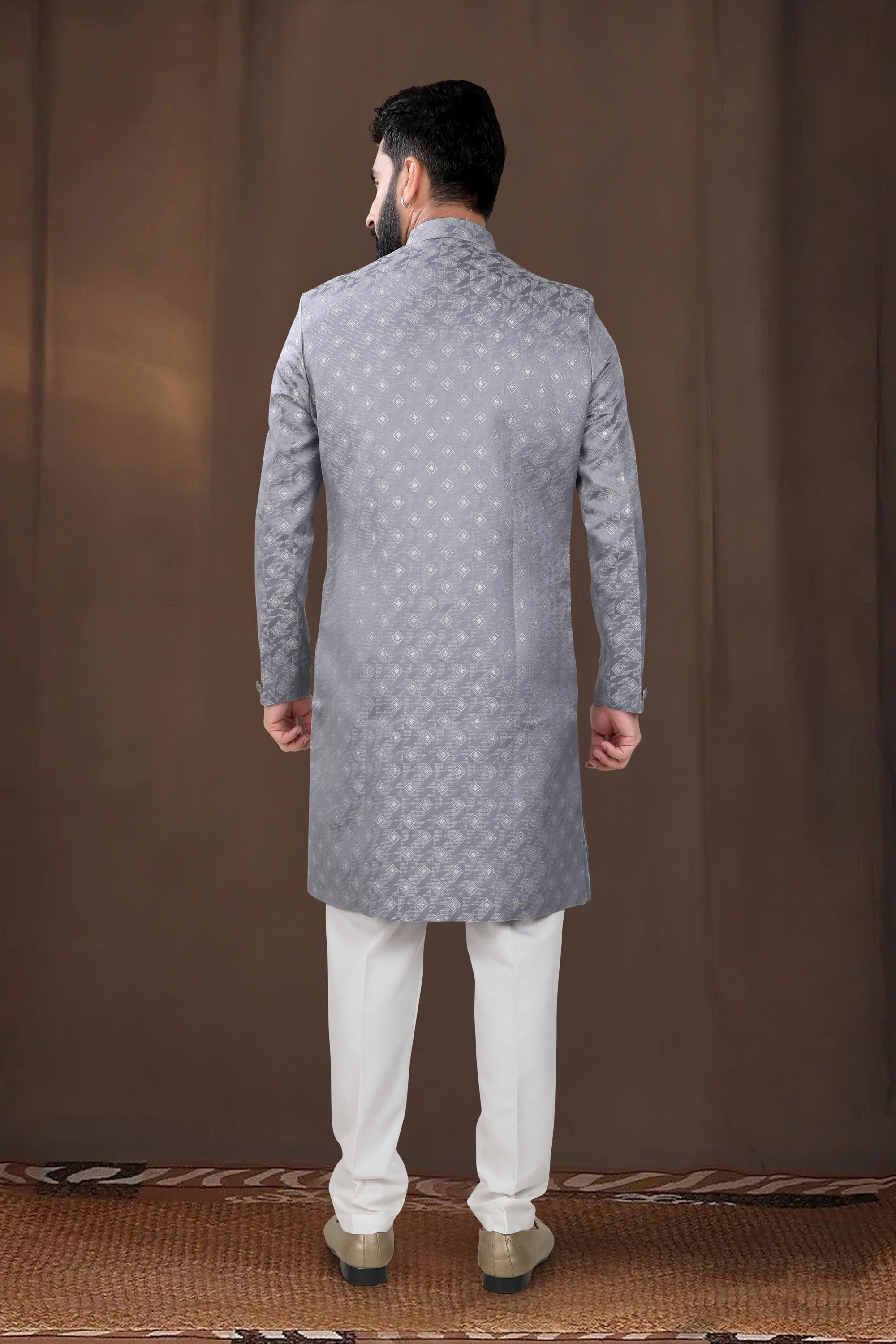 Beautiful Grey Wedding Wear Readymade Indo Western For Men In Jacquard Fabric
