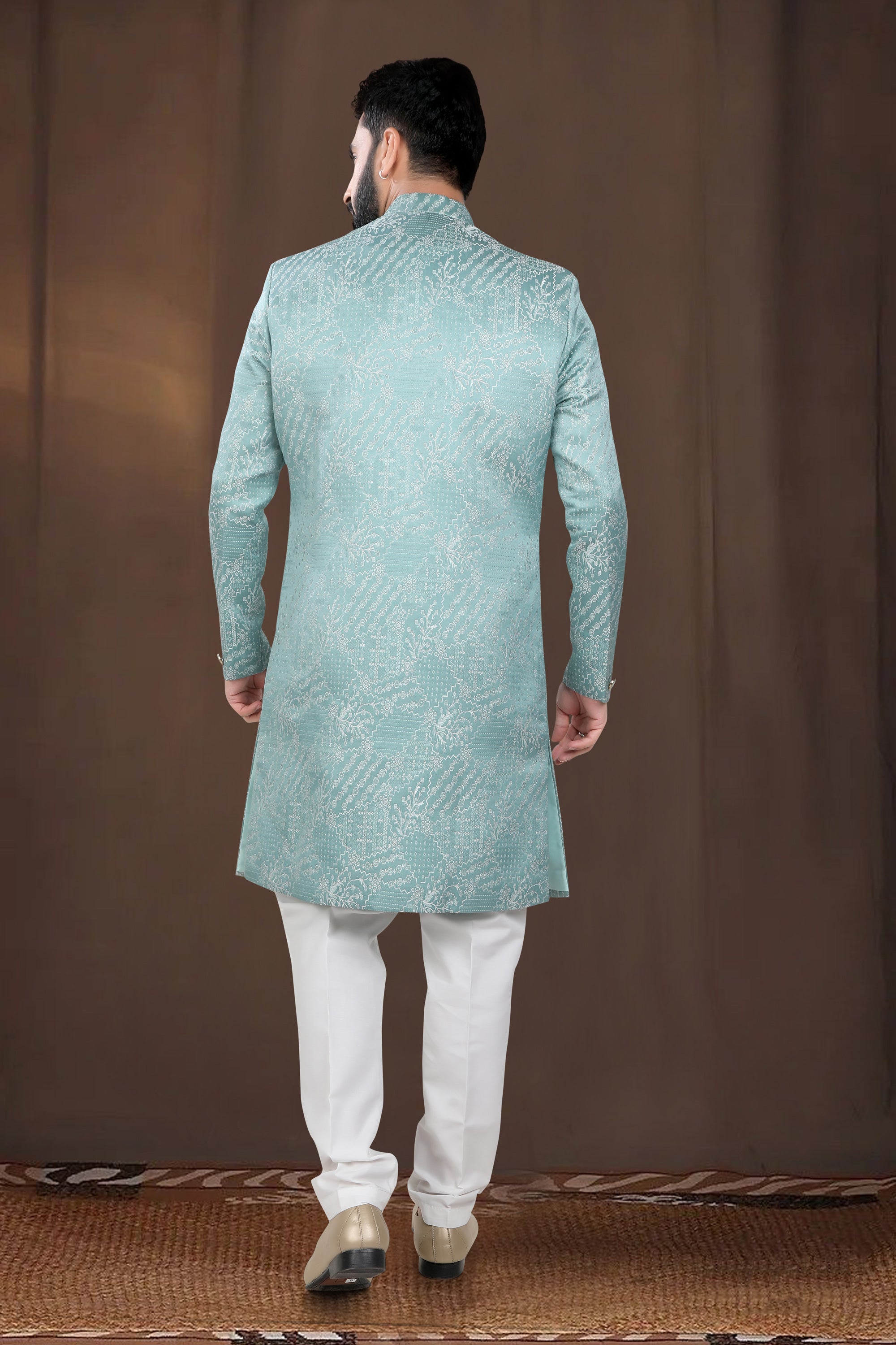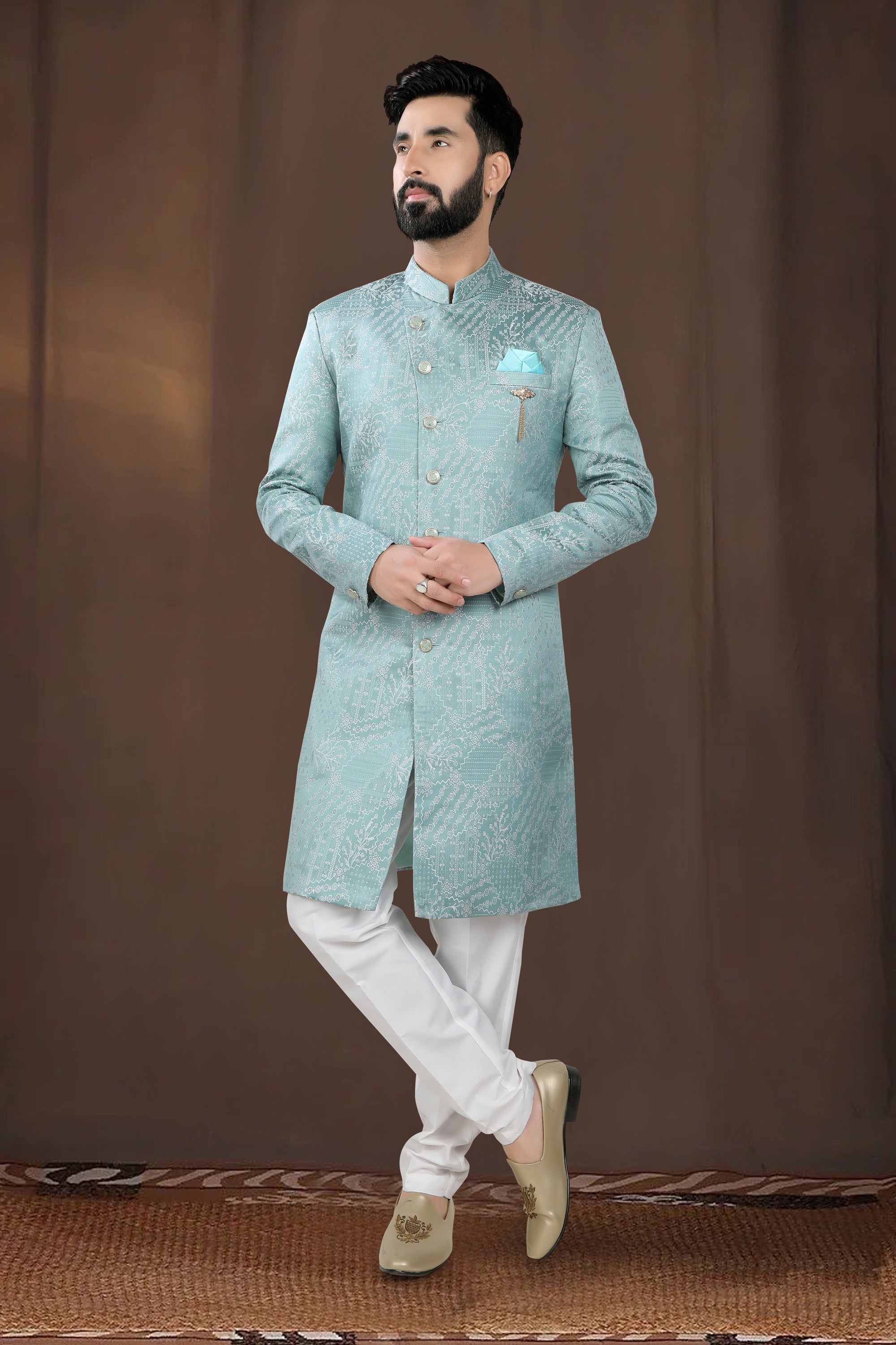 Blue Jacquard Wedding Wear Readymade Indo Western For Men
