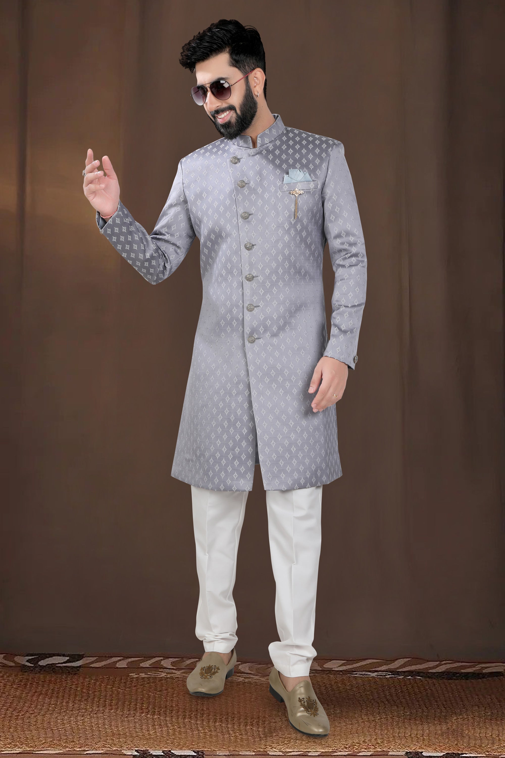Grey Engaging Jacquard Festive Wear Readymade Indo Western For Men