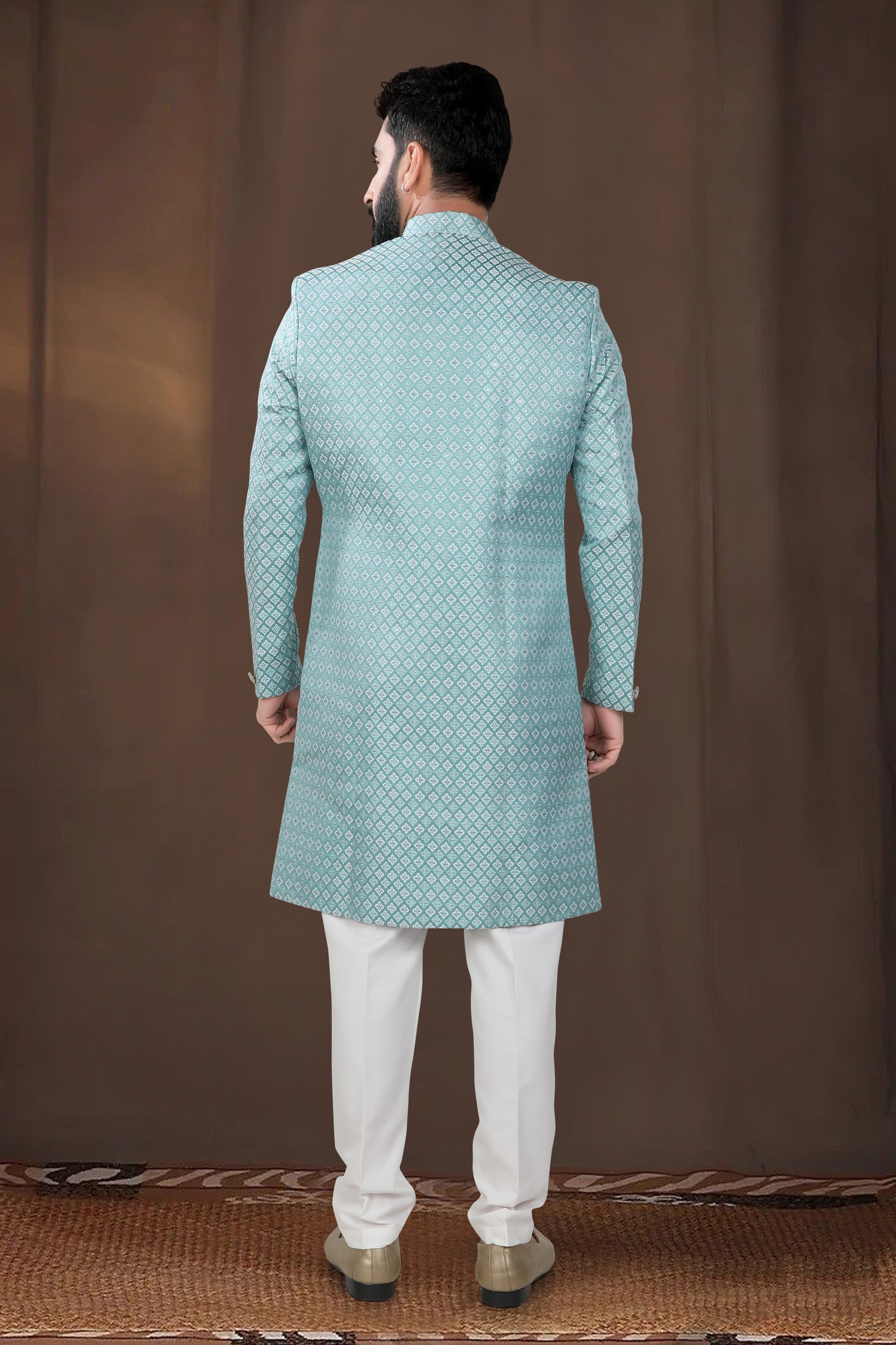 Jacquard Wedding Wear Attractive Readymade Men Indo Western In Green Color