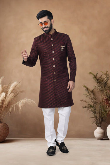Maroon Beautiful Jacquard Wedding Wear Readymade Indo Western For Men