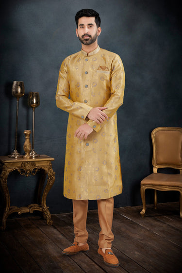Wedding Wear Golden Color Jacquard Fabric Attractive Readymade Indo Western Suit For Men