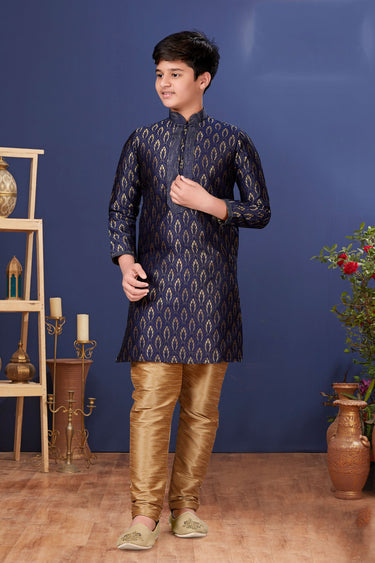 Function Wear Jacquard Silk Fabric Readymade Kurta Pyjama For Boys In Navy Blue Color