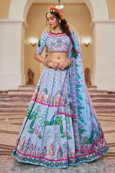 Flaming Blue Art Silk Printed Hand Work Lehenga Choli