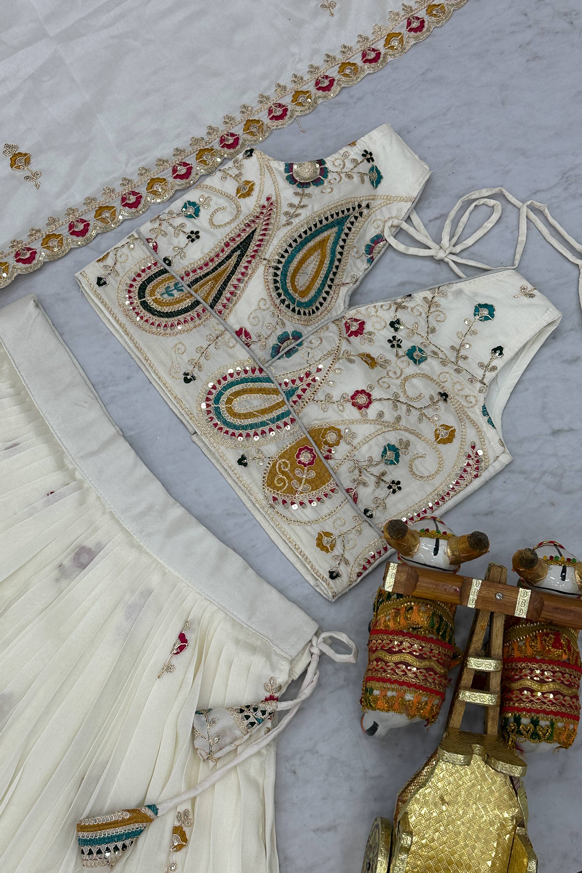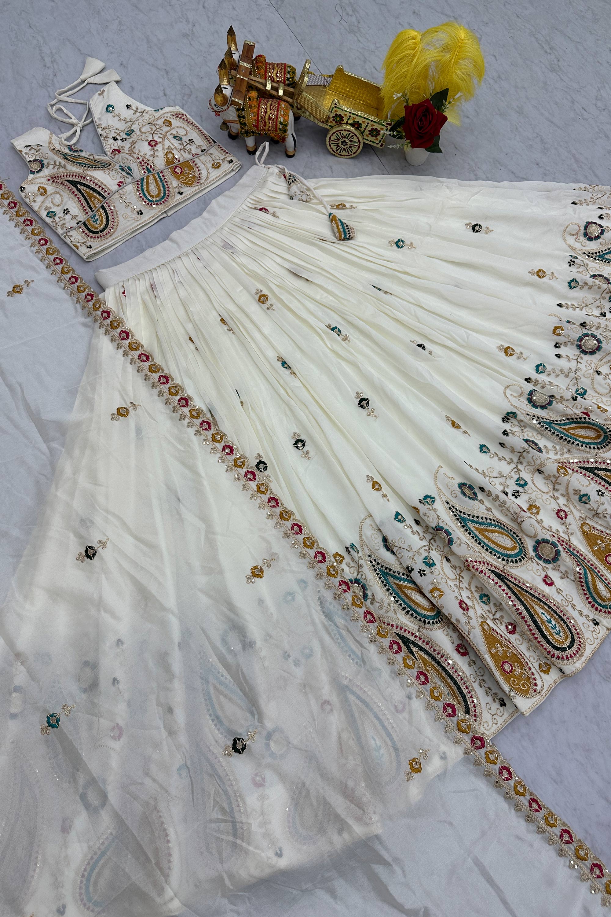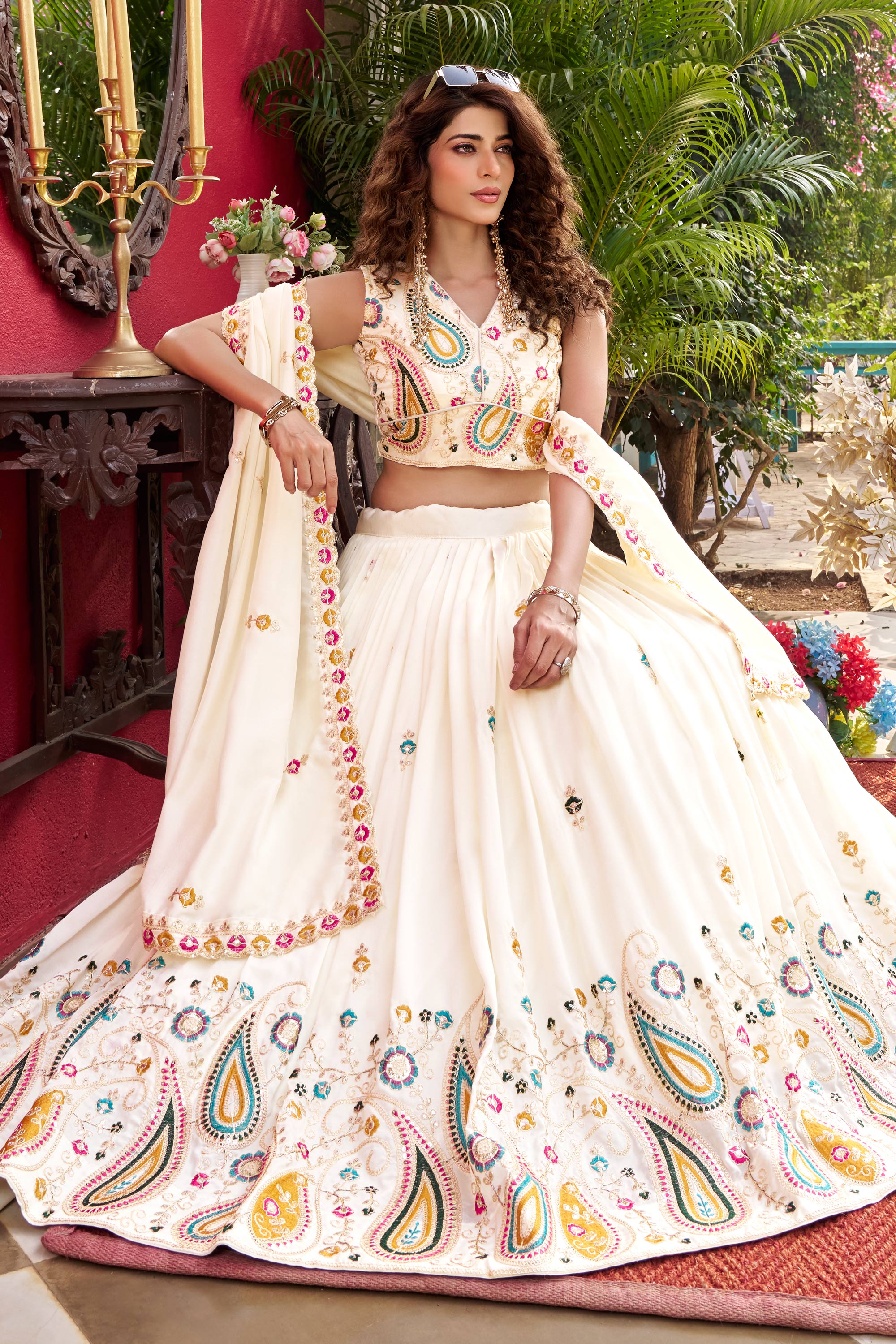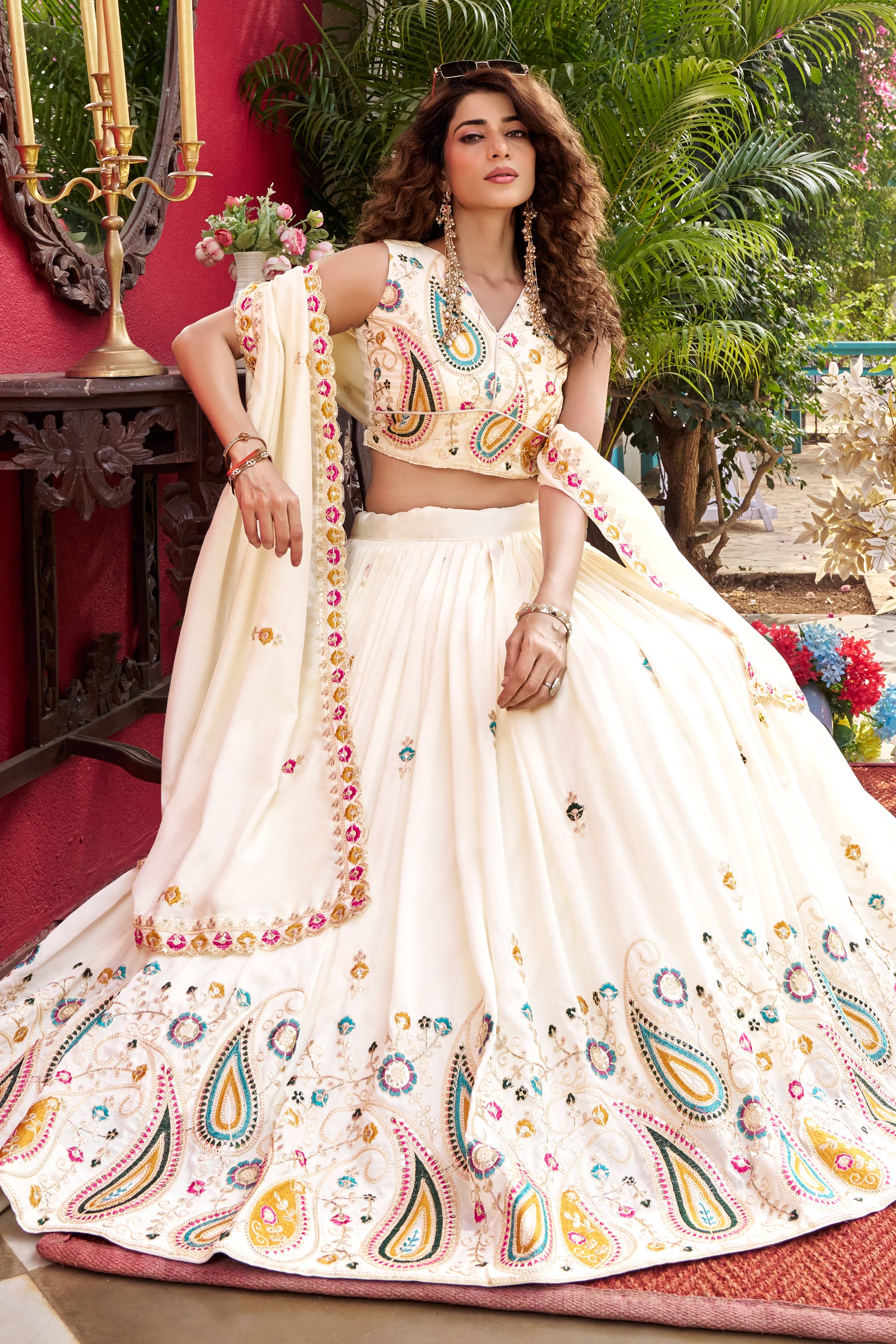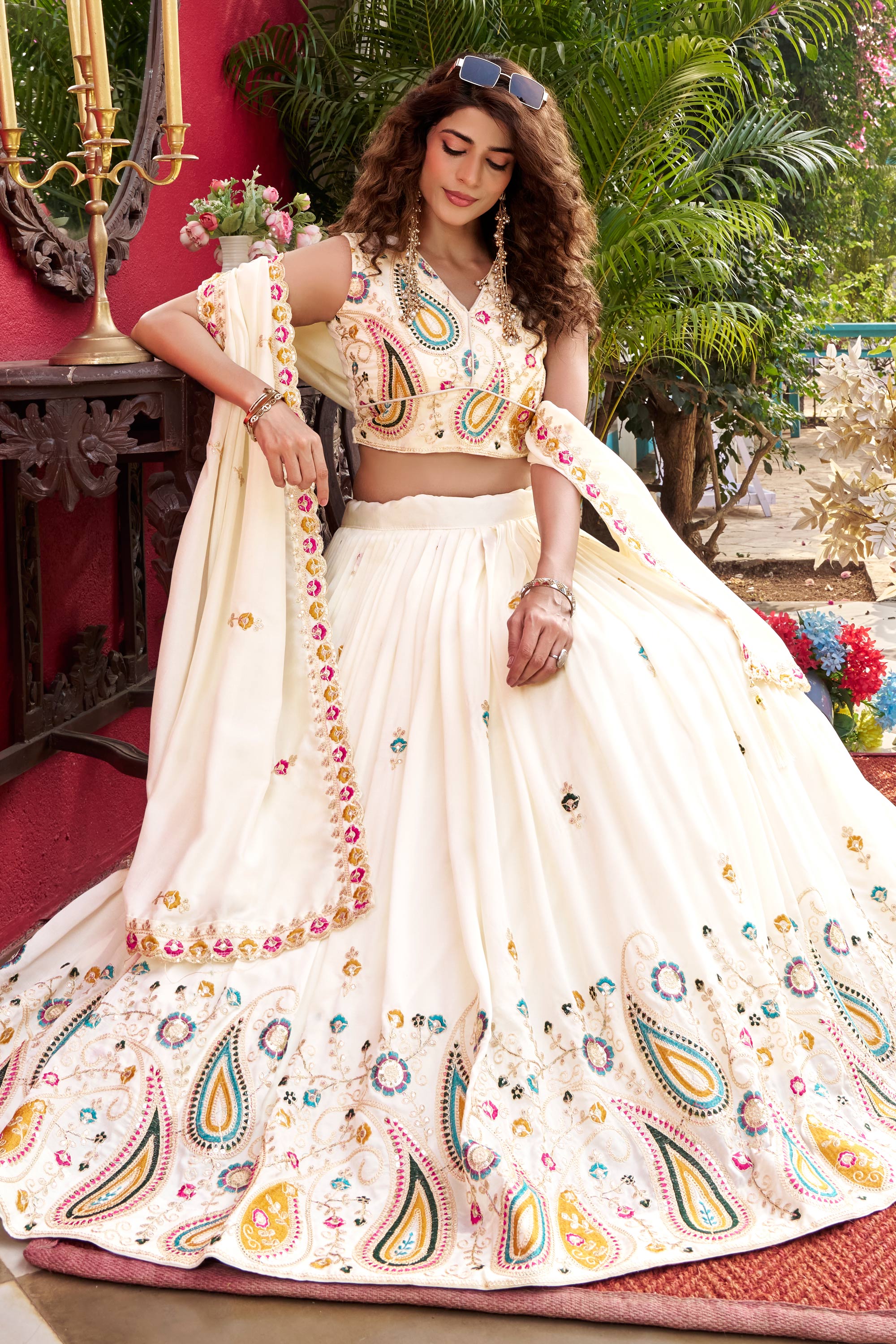 Off White Sangeet Wear Art Silk Embroidered Readymade Lehenga Choli With Dupatta