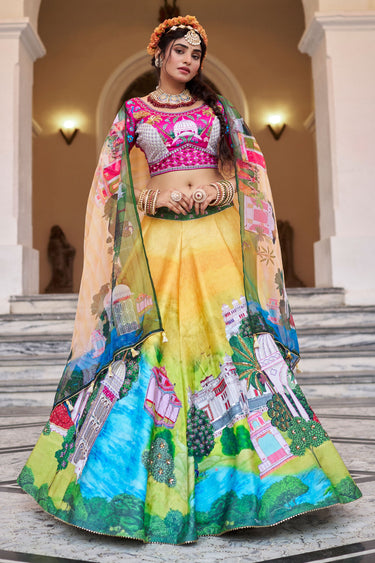 Sapphire Yellow Art Silk Printed Hand Work Wedding Lehenga Choli