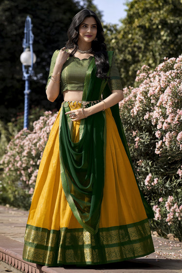 Trendy Kanchipuram With Zari Weaving Yellow Color Art Silk Function Wear Lehenga Choli