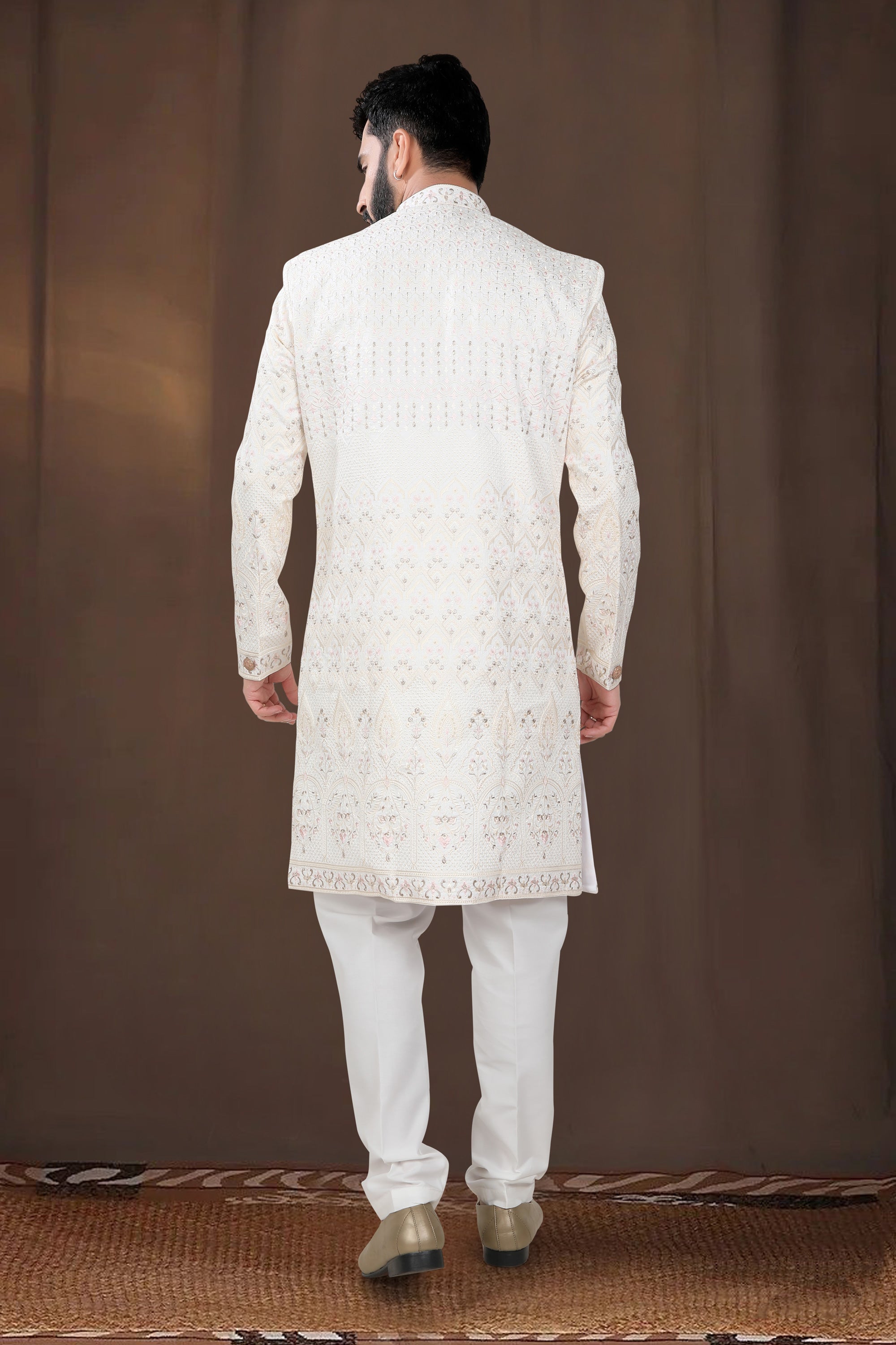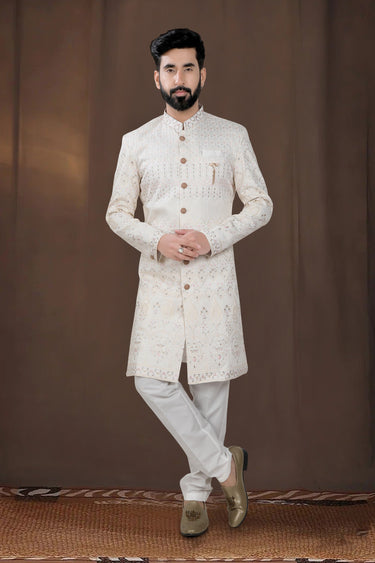 Cream Wedding Wear Silk Designer Readymade Indo Western For Men