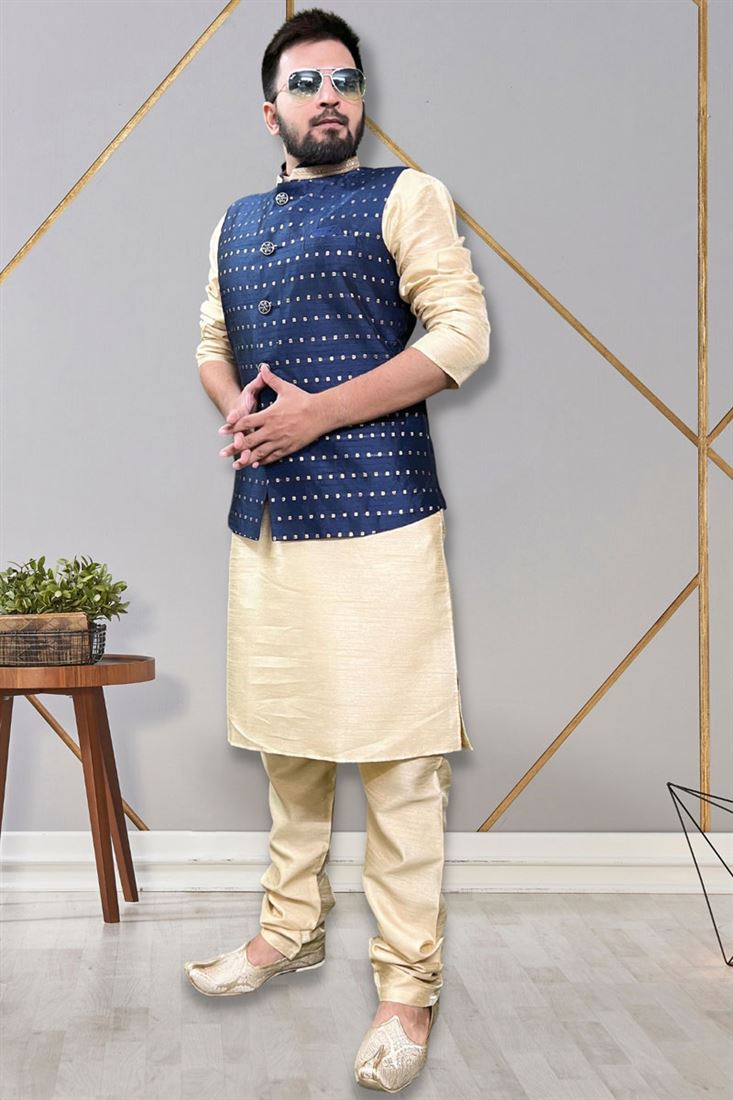 Art Silk Fabric Trendy Readymade Kurta Pyjama For Men With Blue Color Jacket Set