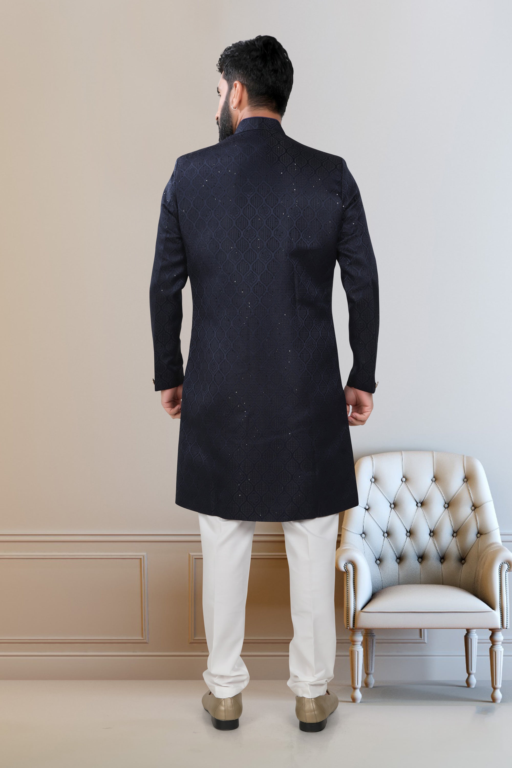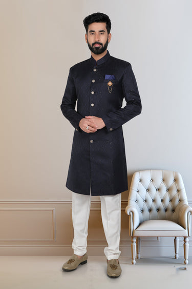 Fancy Fabric Navy Blue Wedding Wear Readymade Designer Men Indo Western
