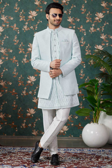 Graceful Sea Green Color Art Silk Fabric Readymade 3 Piece Indo Western