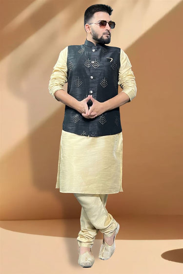Graceful Silk Fabric Function Wear Cream Kurta Pyjama With Black Color Jacket