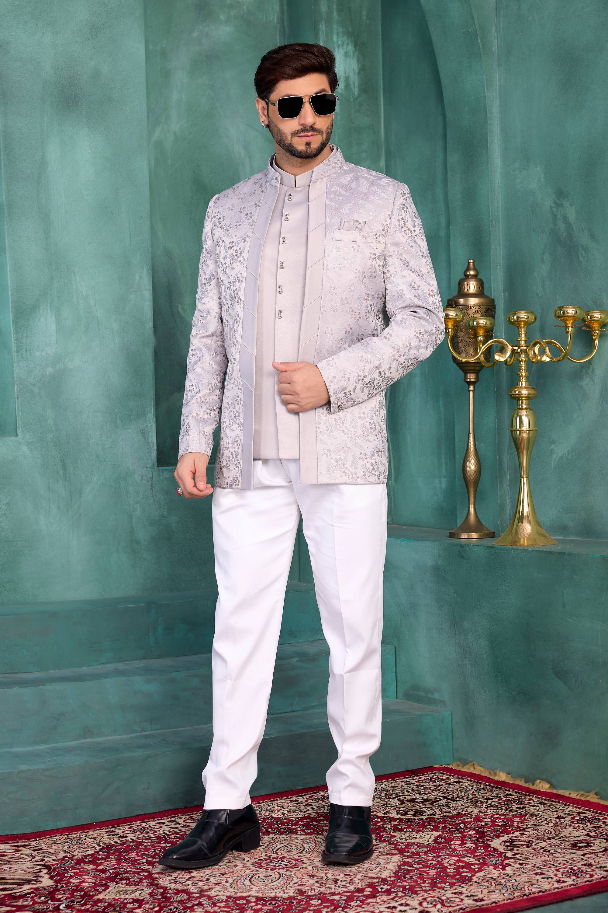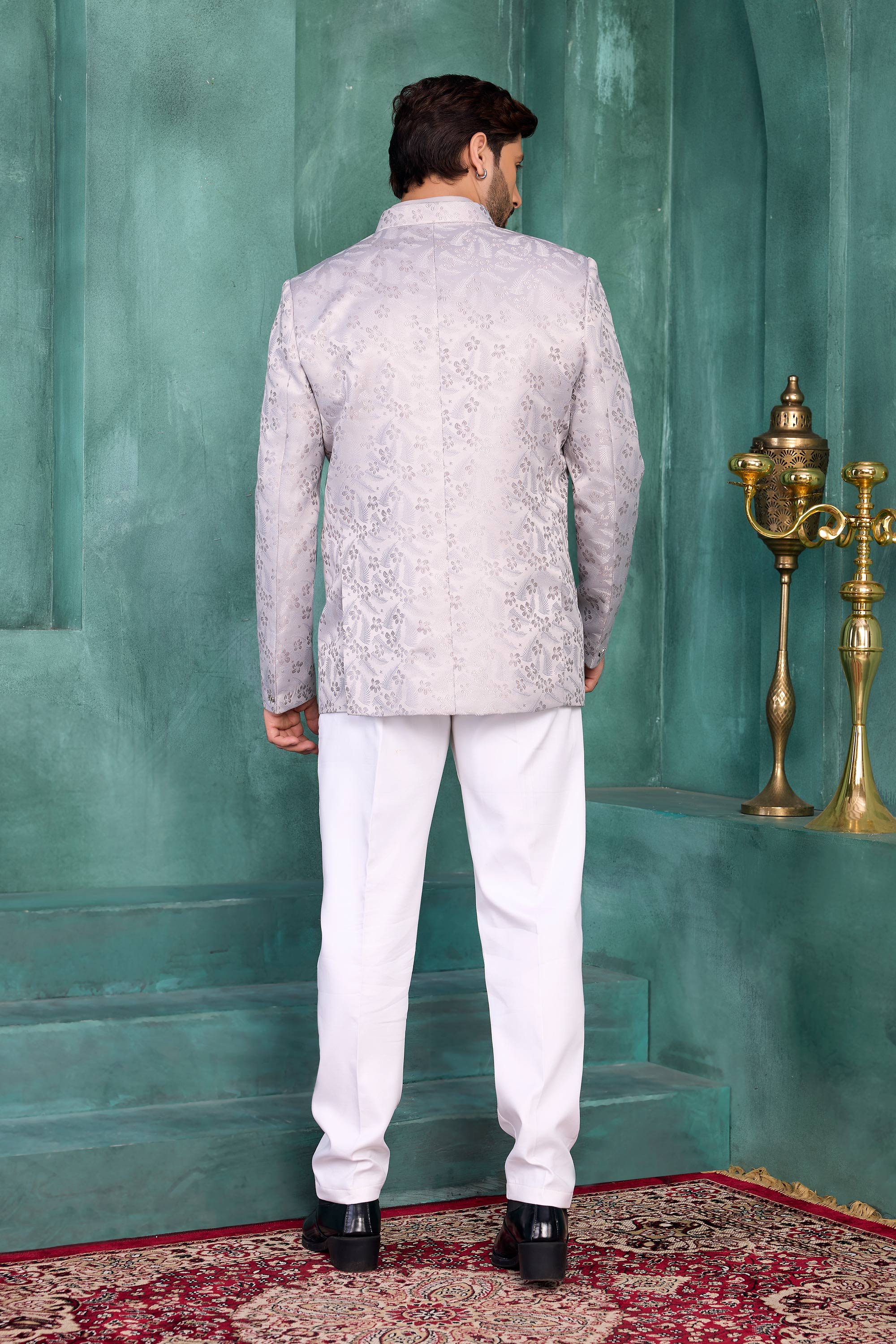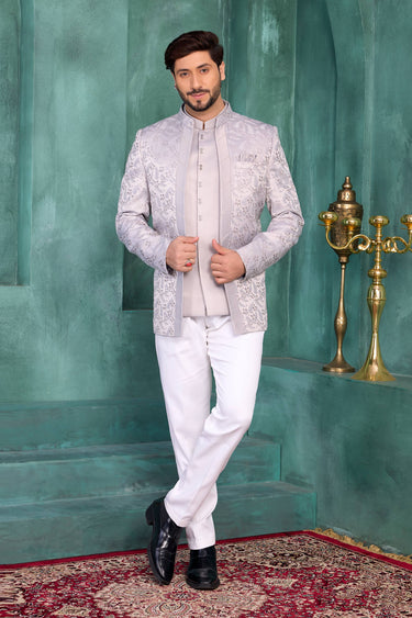 Grey Wedding Wear Jacquard Silk Readymade Jodhpuri Jacket