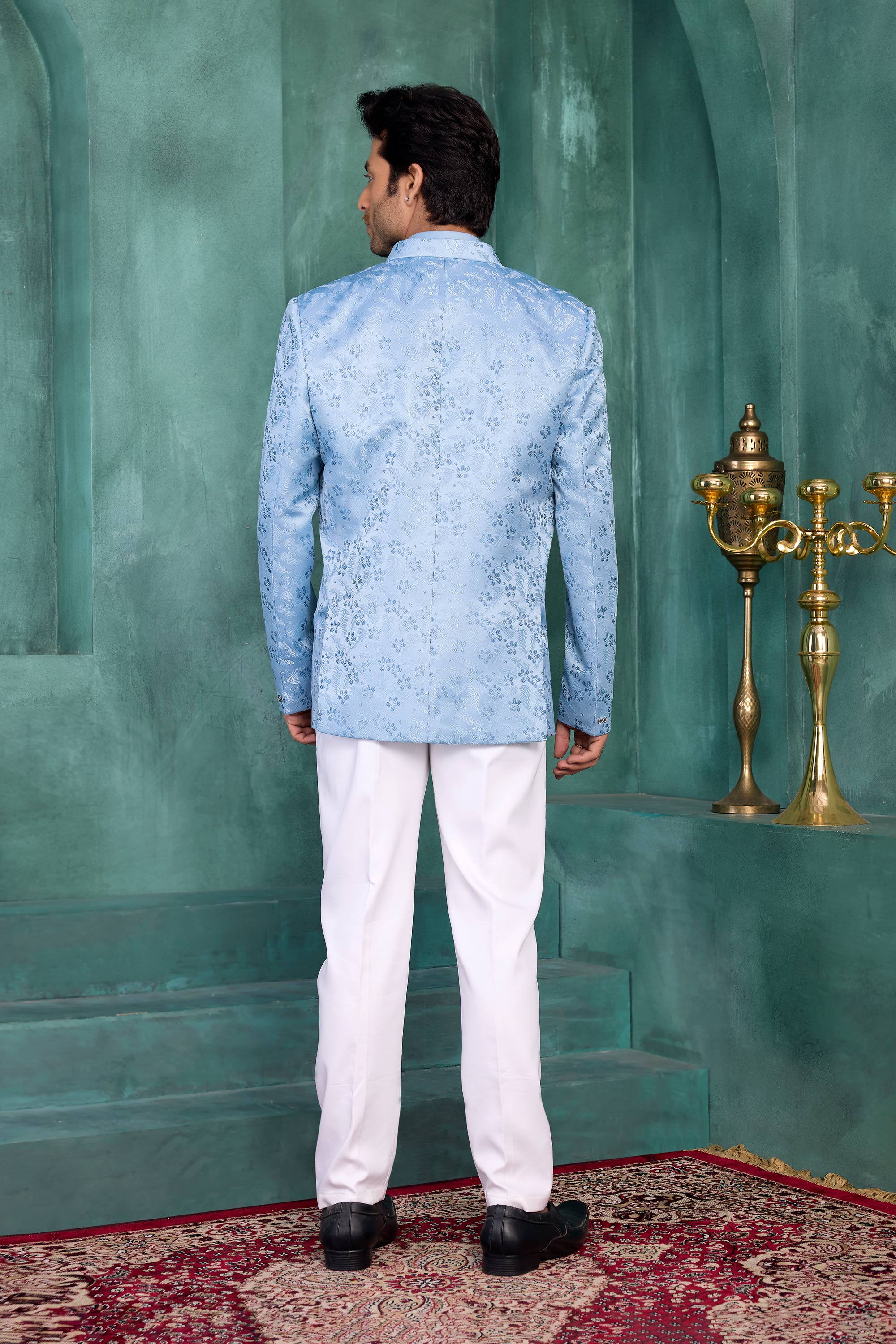 Jacquard Silk Blue Wedding Wear Readymade Jodhpuri Jacket
