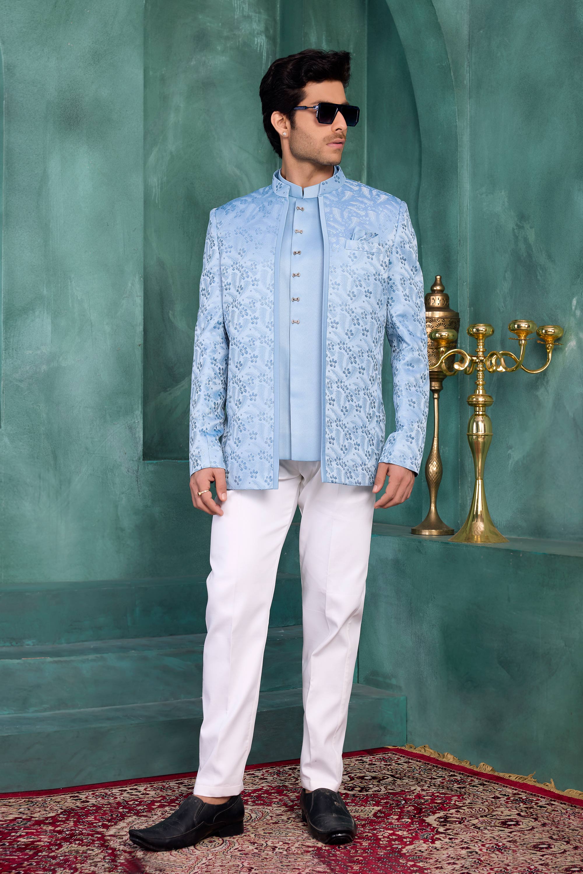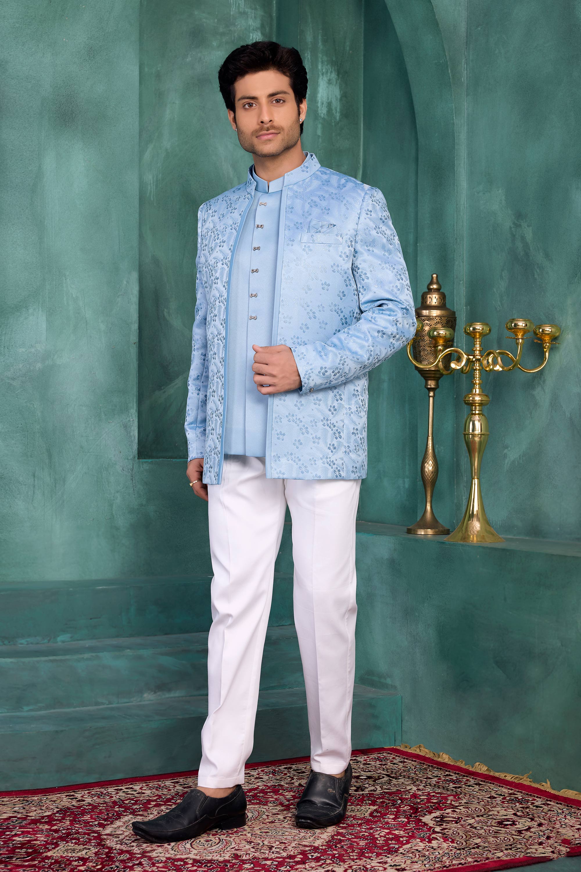 The elegant Jodhpuri silhouette combined with fine embroidery creates a timeless and luxurious look. Pair it with traditional trousers or churidar to complete a sophisticated wedding outfit. Note: Due to digital photography, slight color variations may occur.