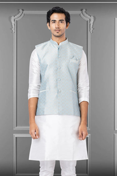 Light Cyan Gorgeous Jacquard Silk Fabric Reception Wear Readymade Jacket For Men