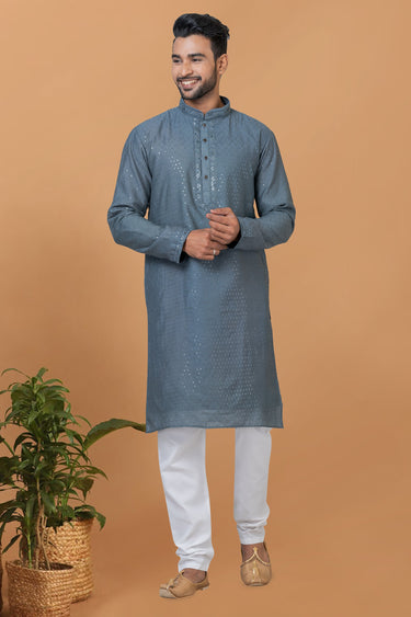 Lovely Grey Color Cotton Sequins Embroidery Readymade Kurta Pyjama For Men