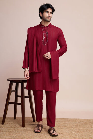 Maroon Color Festive Wear Readymade Men Stylish Kurta Pyjama With Dupatta