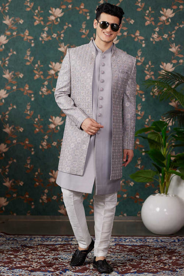 Readymade Grey Color Art Silk Fabric Royal 3 Piece Indo Western