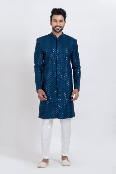 Reception Wear Attractive Sequins Work Readymade Men Indo Western In Teal Color