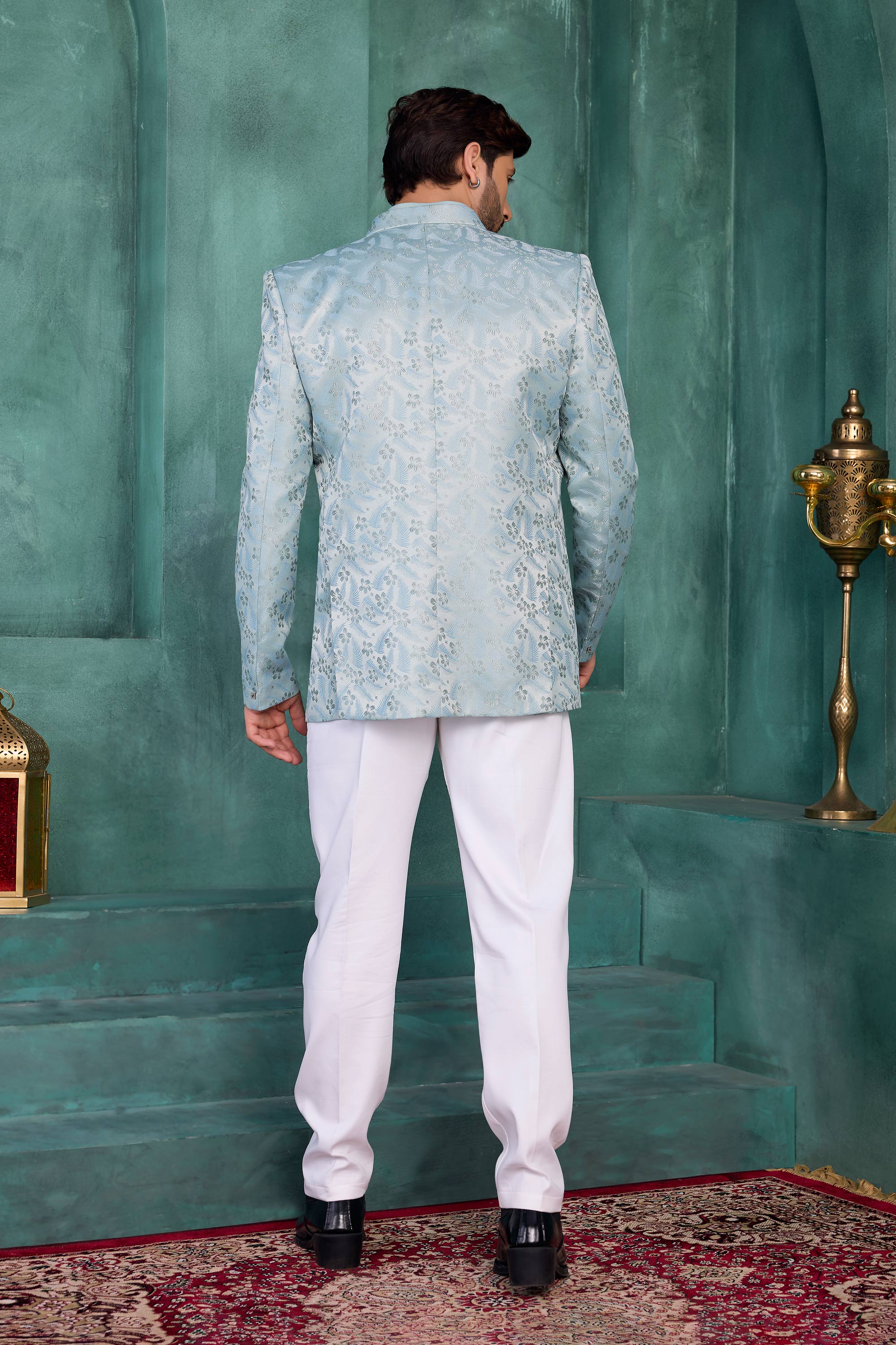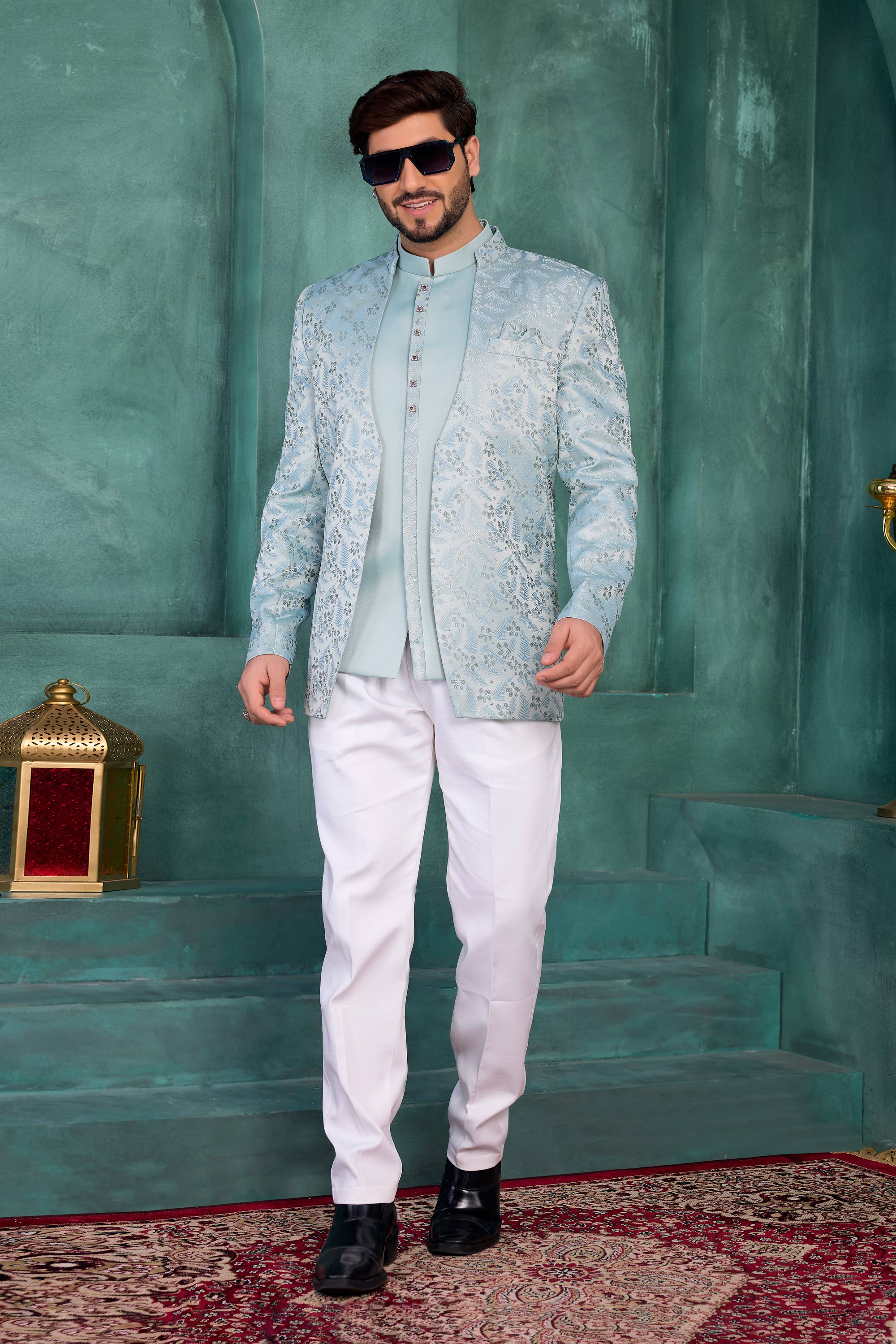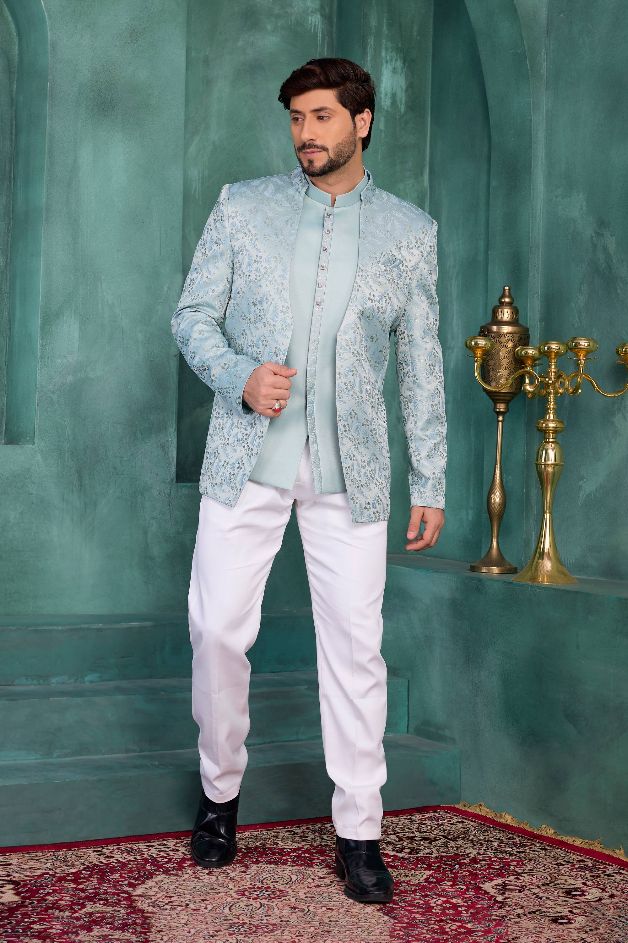 Sea Green Wedding Wear Jacquard Silk Fabric Jodhpuri Jacket