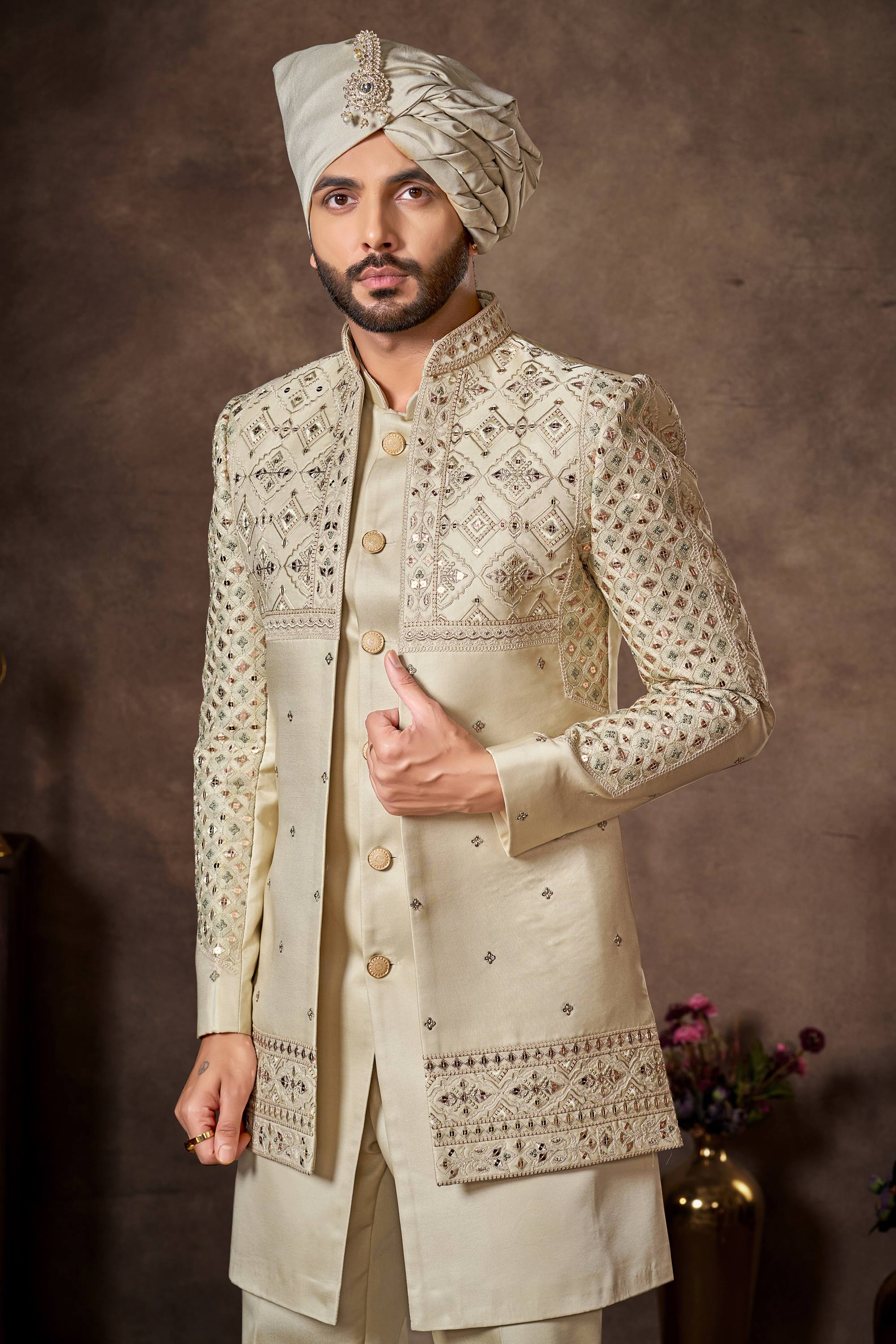 Silk Embroidered Cream Wedding Wear Readymade Indo Western For Men