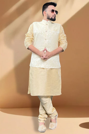 Silk Fabric Function Wear Artistic Cream Kurta Pyjama With Cream Color Jacket