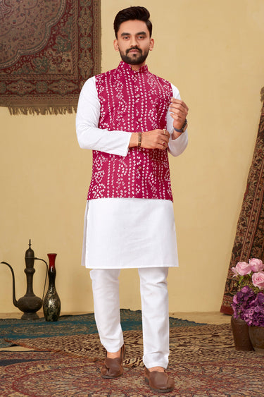 Traditional Pink Color Cotton Kurta Pyjama With Bandhani Print Jacket For Men