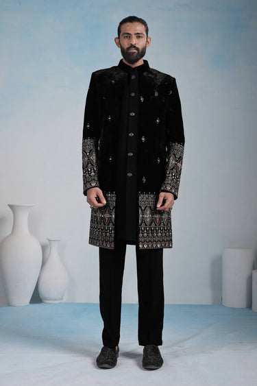 Velvet Black Embroidered Men Readymade Indo Western For Wedding Wear