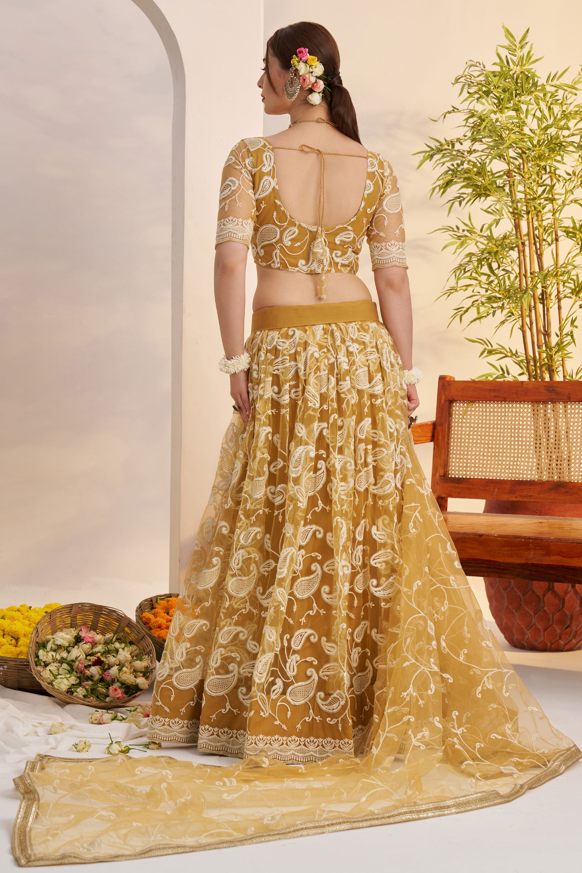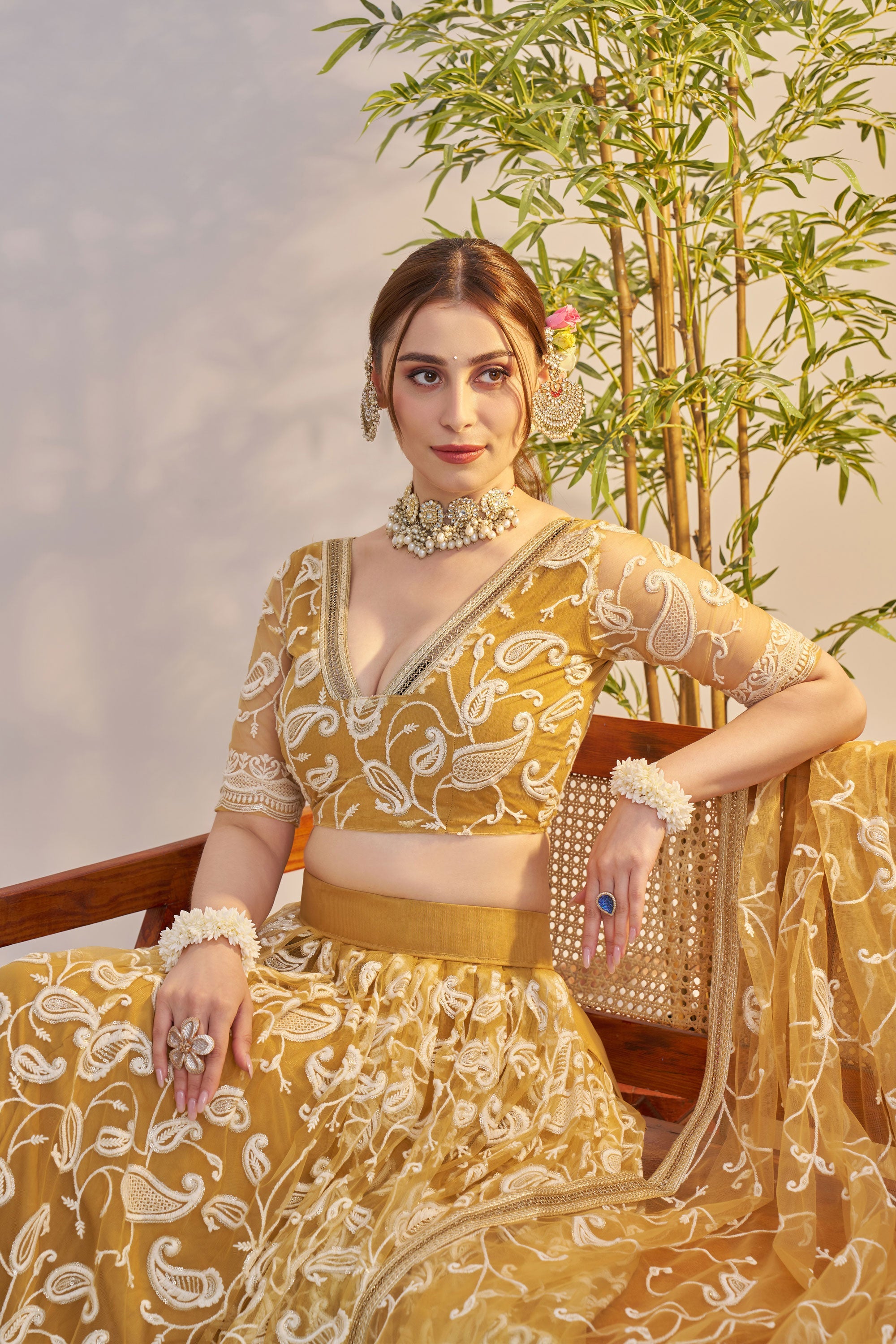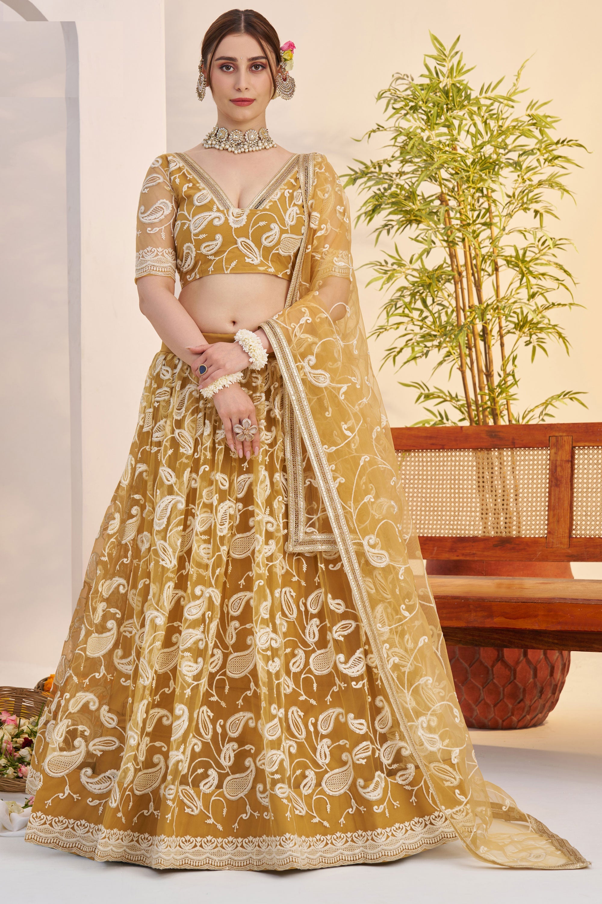 Attractive Function Wear Mustrad Embroidered Net Fabric Lehenga