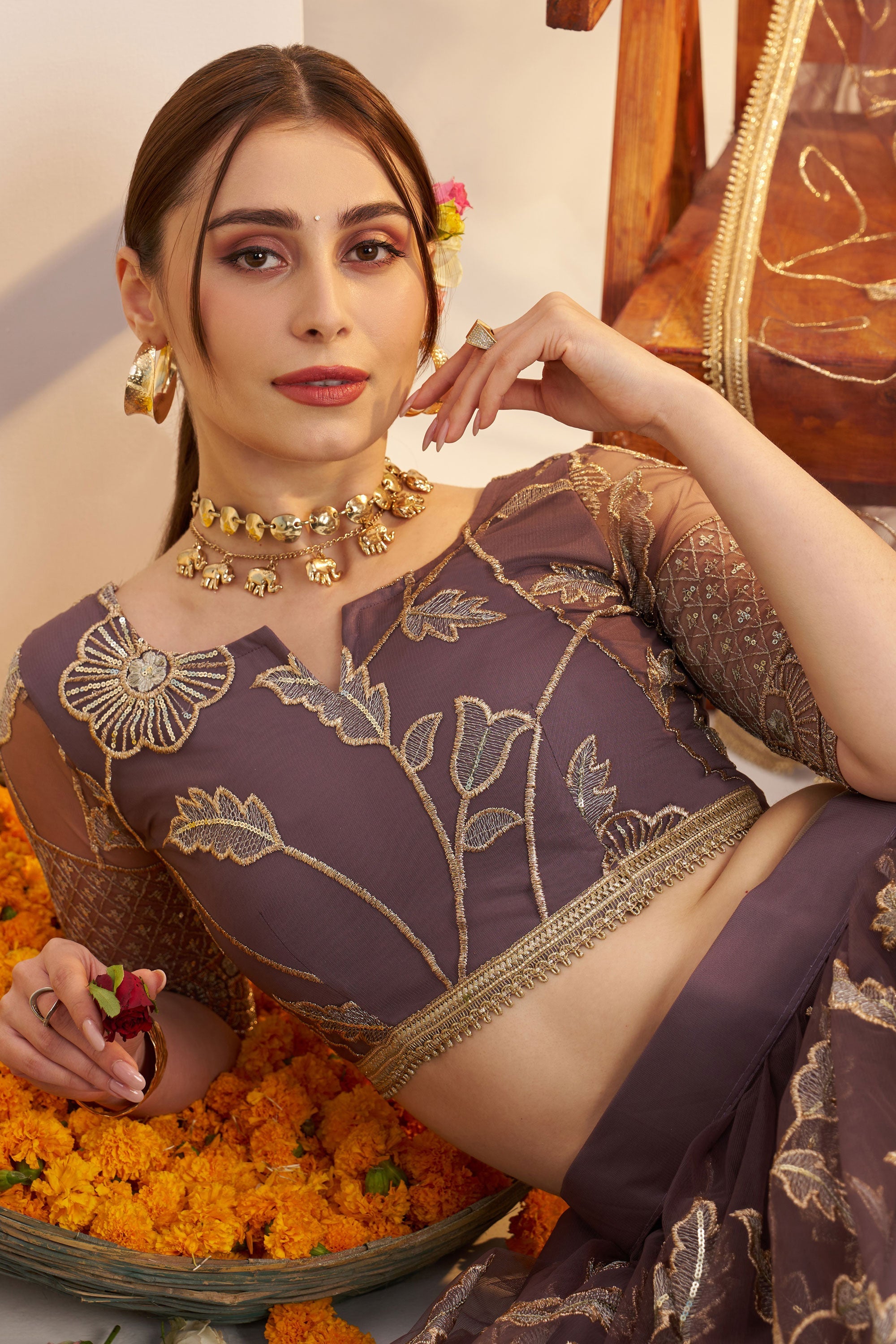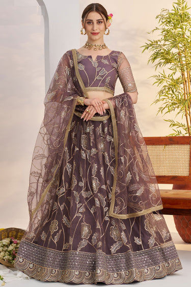 Glorious Function Wear Brown Embroidered Net Fabric Lehenga