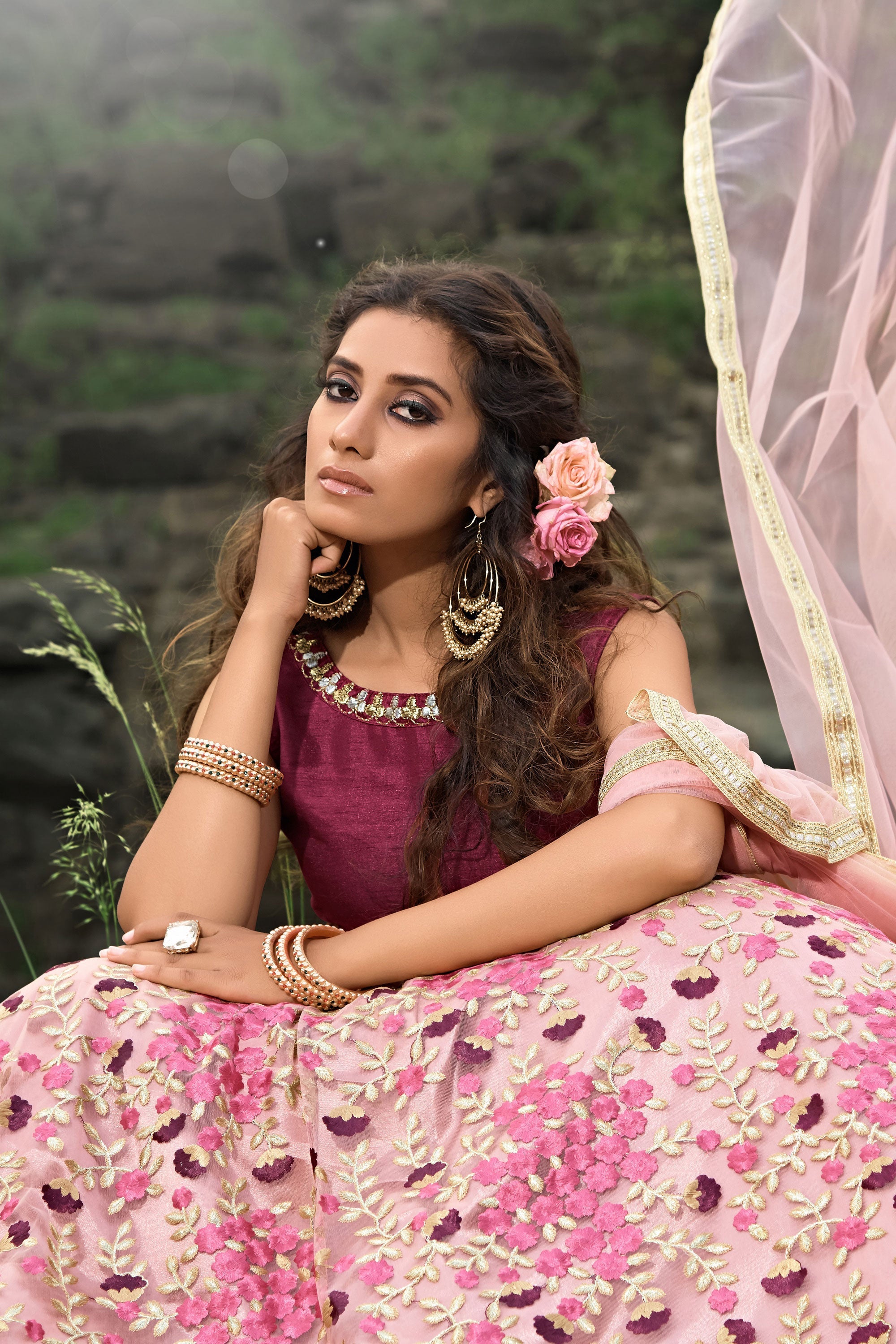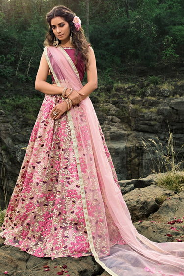 Net Fabric Pink Color Stylish Sequins Embroidered Lehenga