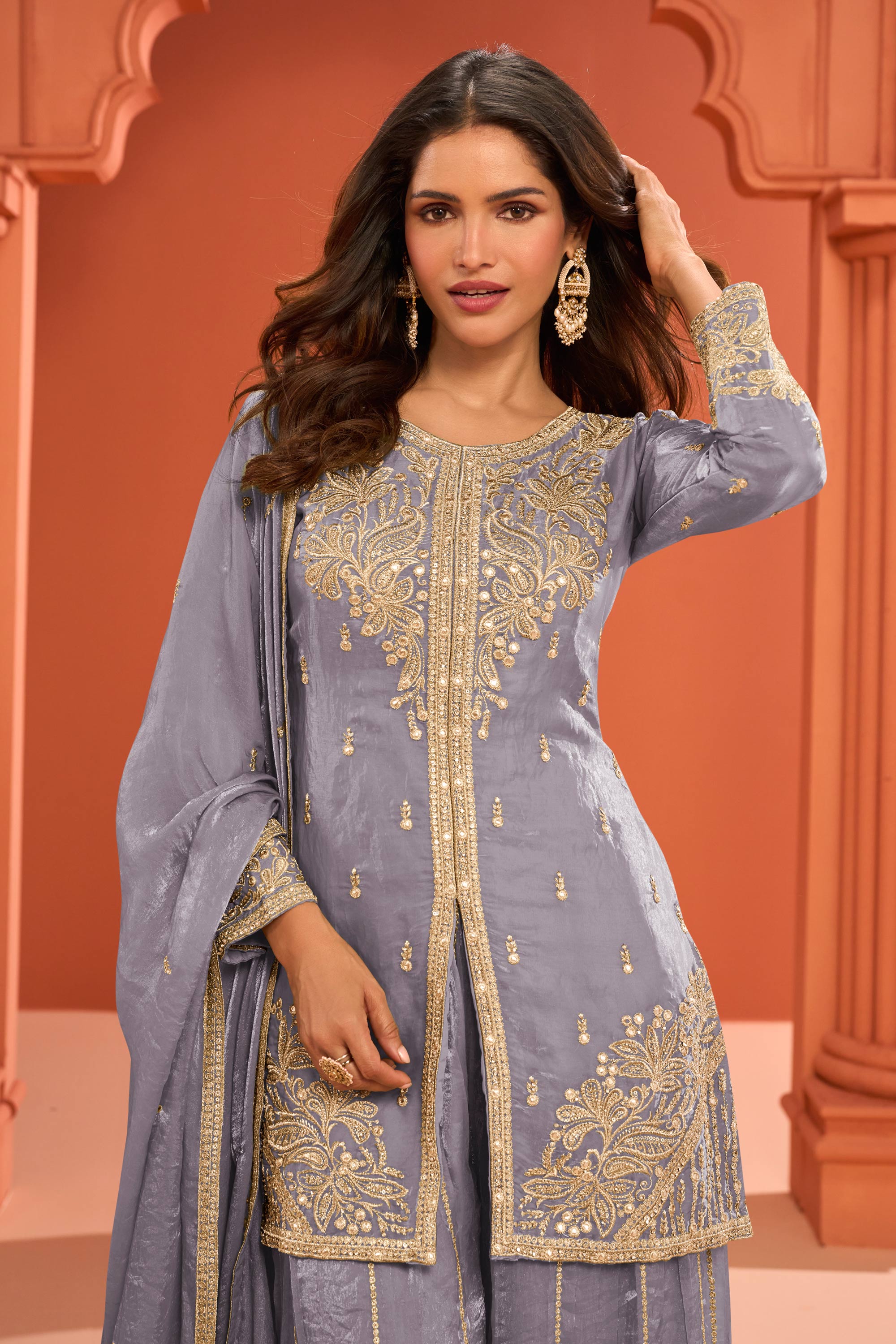 Step into celebration ready style with this Readymade Palazzo Salwar Kameez, crafted entirely from luxurious Art Silk fabric for the top, bottom, and dupatta. The outfit is decorated with fine embroidery work, adding sophistication and grace. Perfect for sangeet nights, functions, and special events, this rich colored ensemble blends tradition with modern elegance. Due to digital photography, slight color variations may occur.