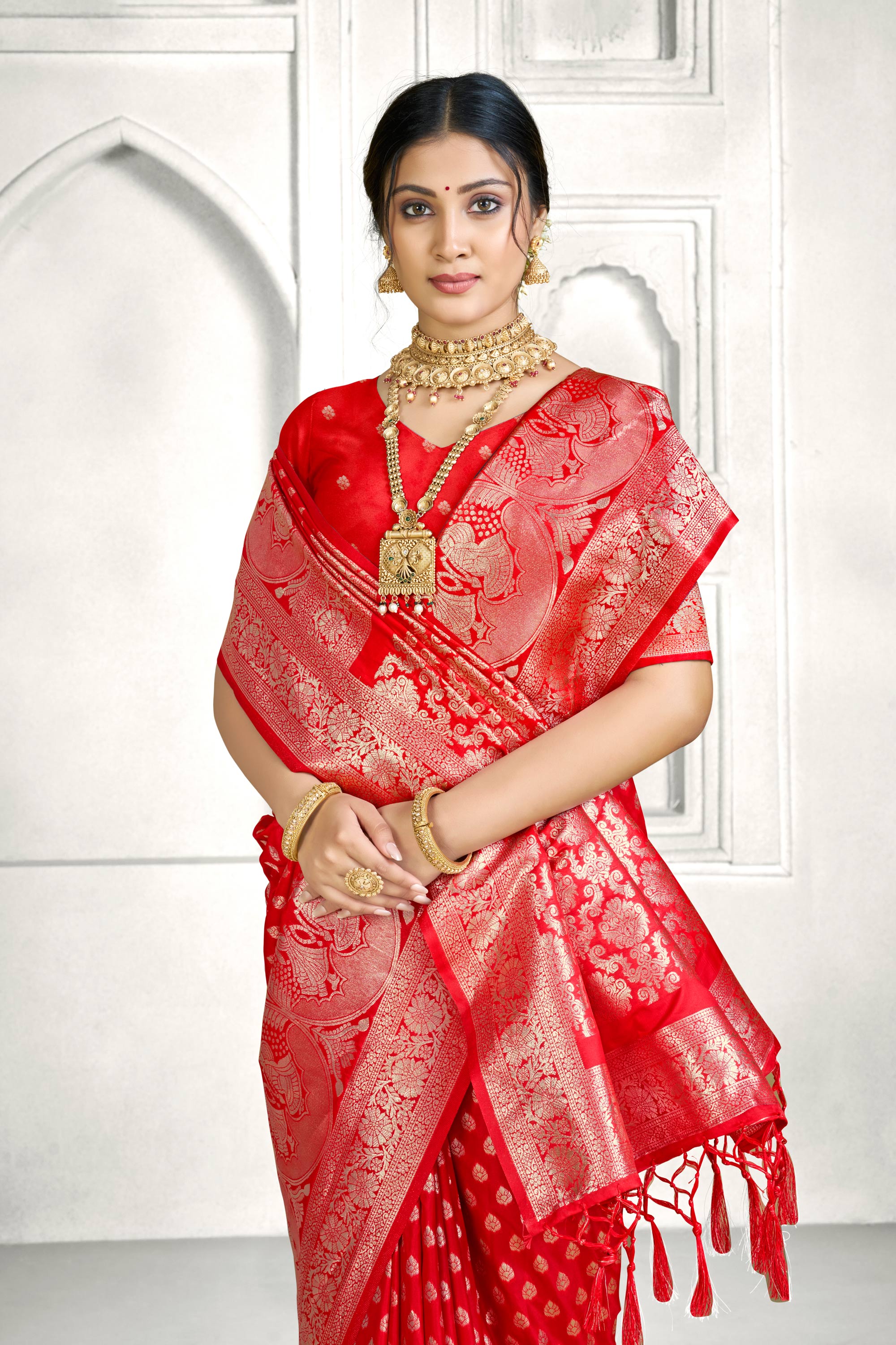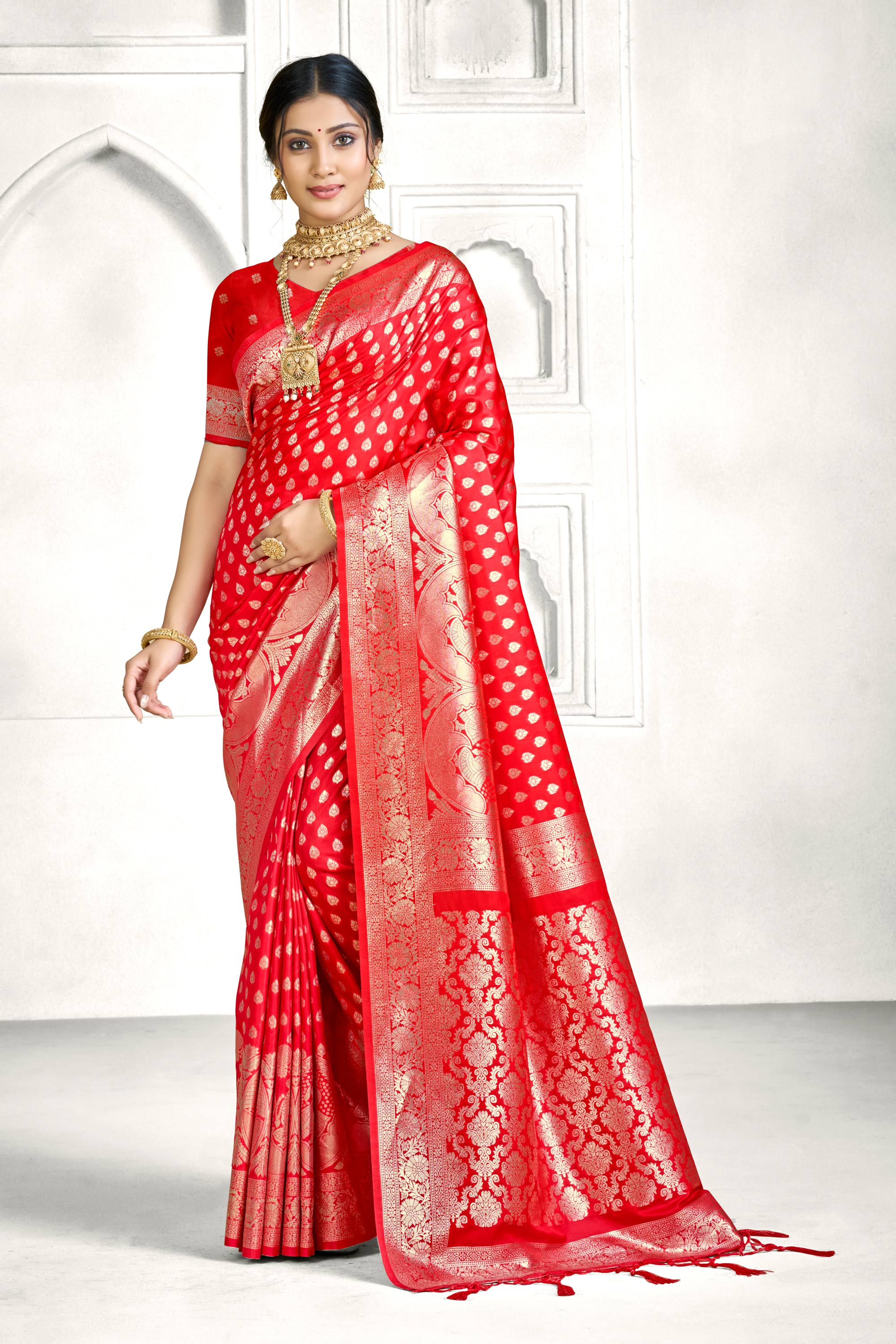 This Traditional Banarasi Silk Saree is crafted from rich Banarasi Silk fabric, featuring elegant weaving work that highlights its classic heritage appeal. The saree comes in a beautiful red color, making it a perfect choice for functions and traditional occasions. It includes a matching Banarasi Silk blouse fabric for customized stitching. Due to digital photography, slight color variations may occur.