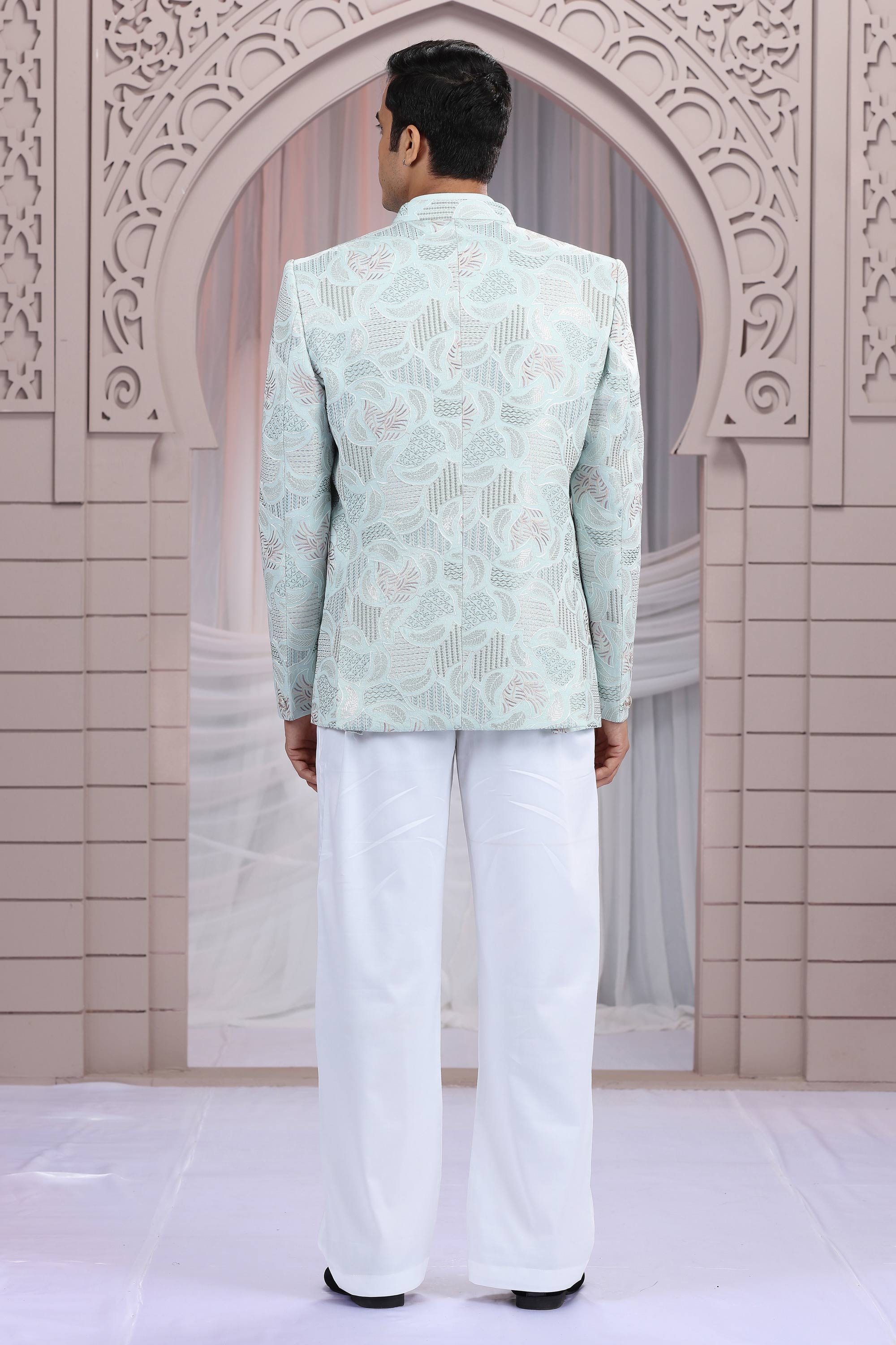 Art Silk Stunning Light Cyan Wedding Wear Readymade Men Indo Western Jodhpuri Suit