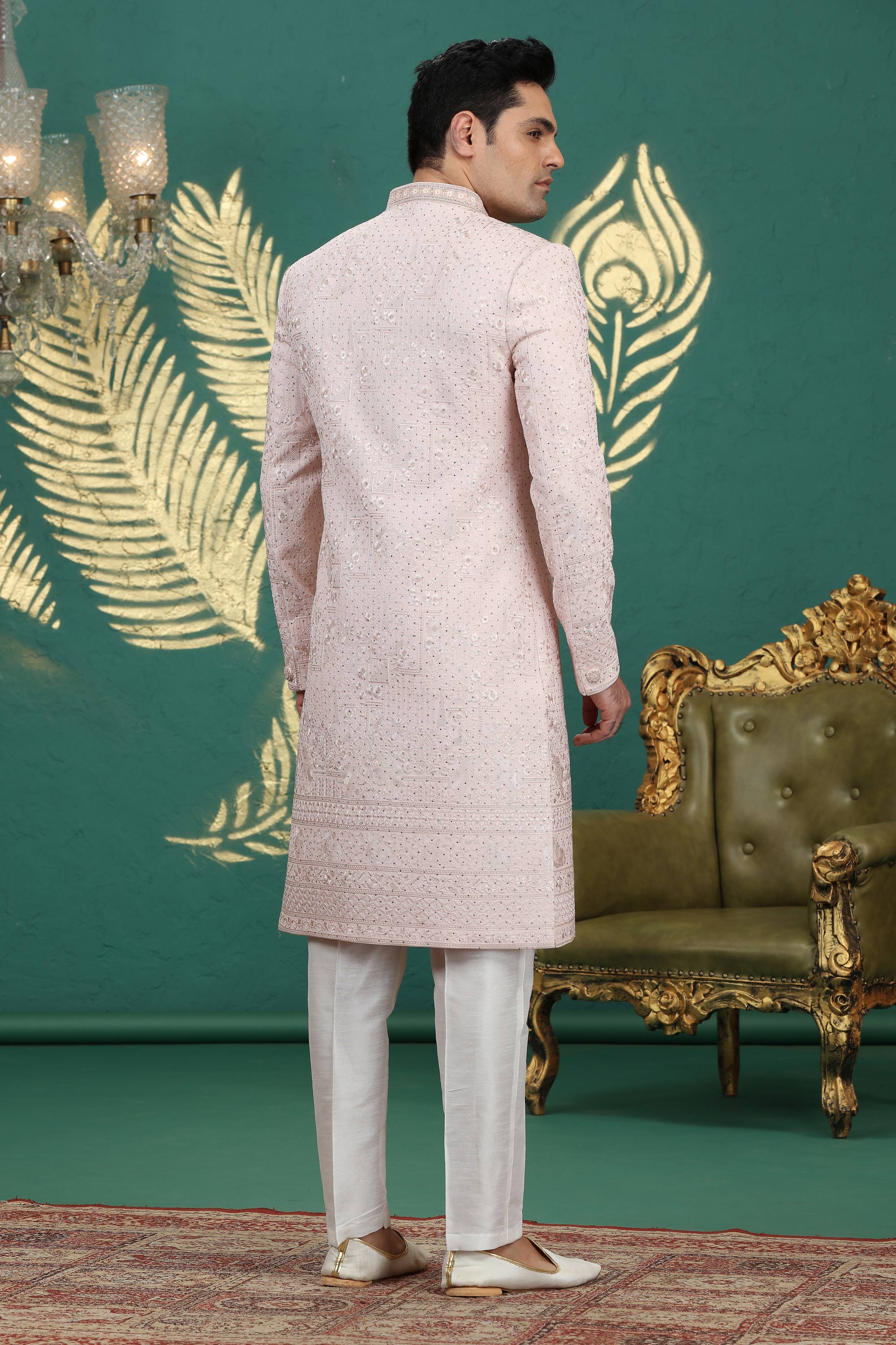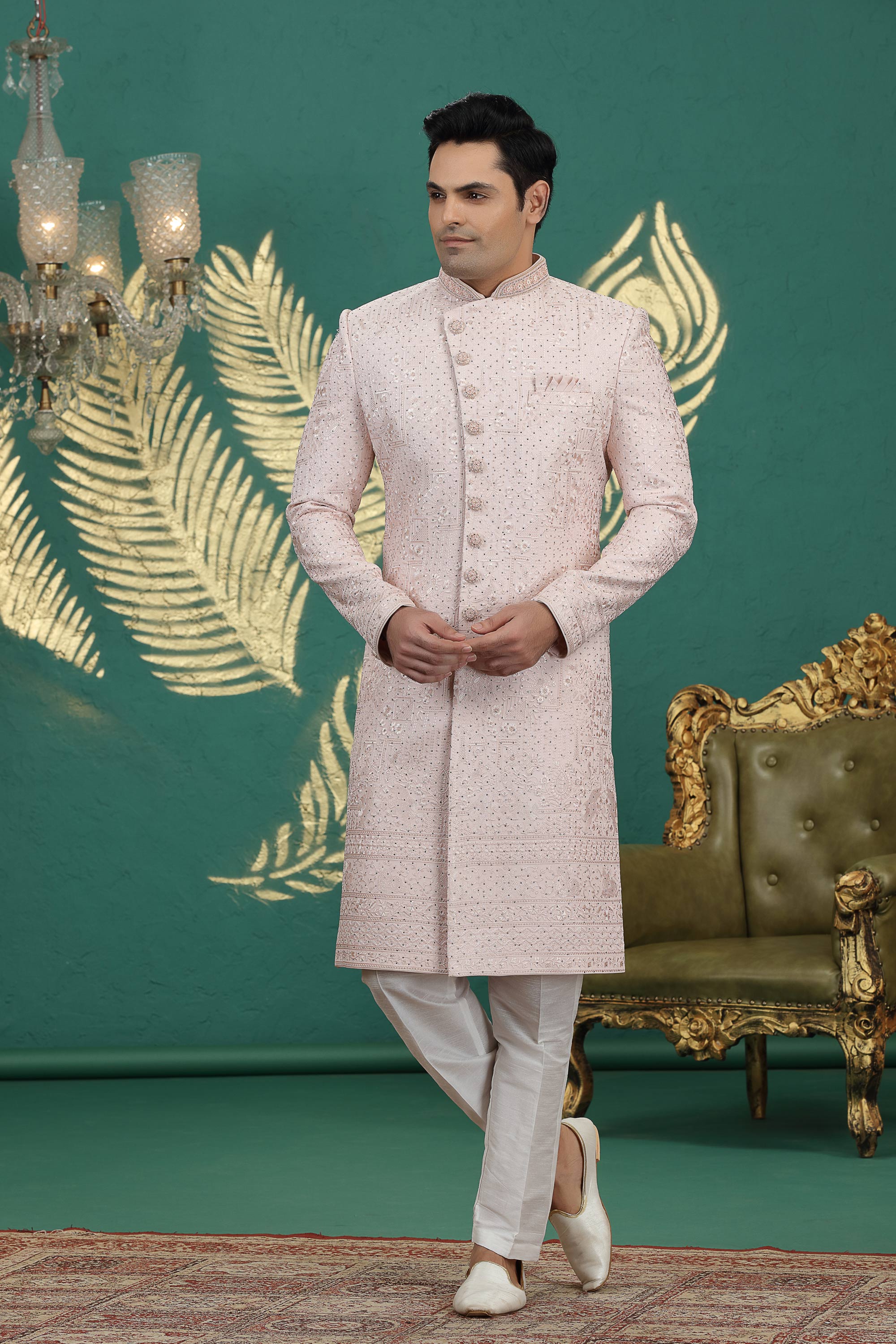 Crafted for a modern groom with a touch of traditional charm, this ivory sherwani features exquisite embroidery and rich detailing. Made with high-quality materials, it ensures comfort while maintaining a sophisticated look. Perfect for weddings, receptions, or formal ceremonies, this sherwani enhances your style with a blend of cultural heritage and contemporary flair. Comes with a coordinating churidar to complete the outfit. Make your special day unforgettable with this ready-to-wear masterpiece.