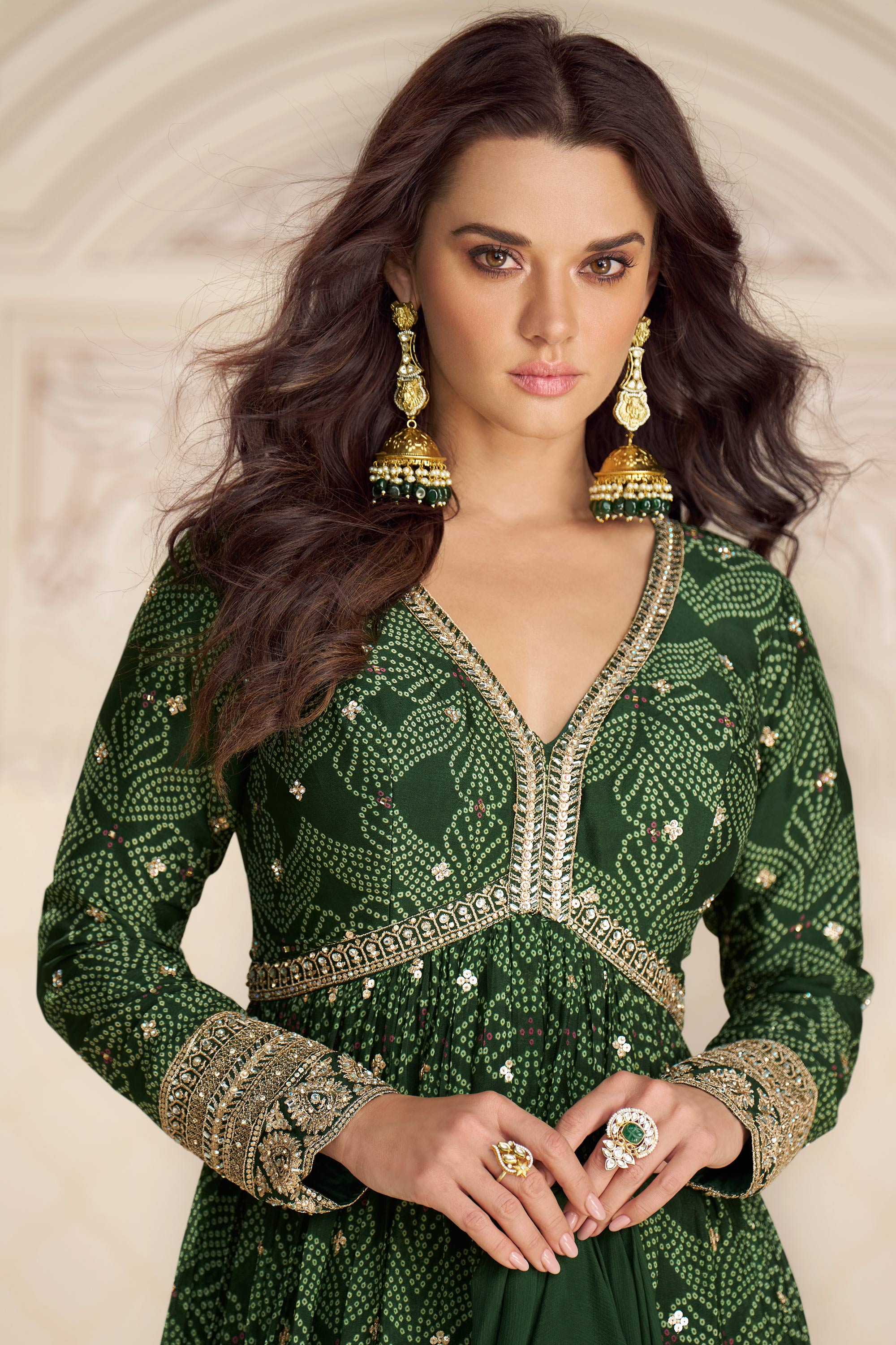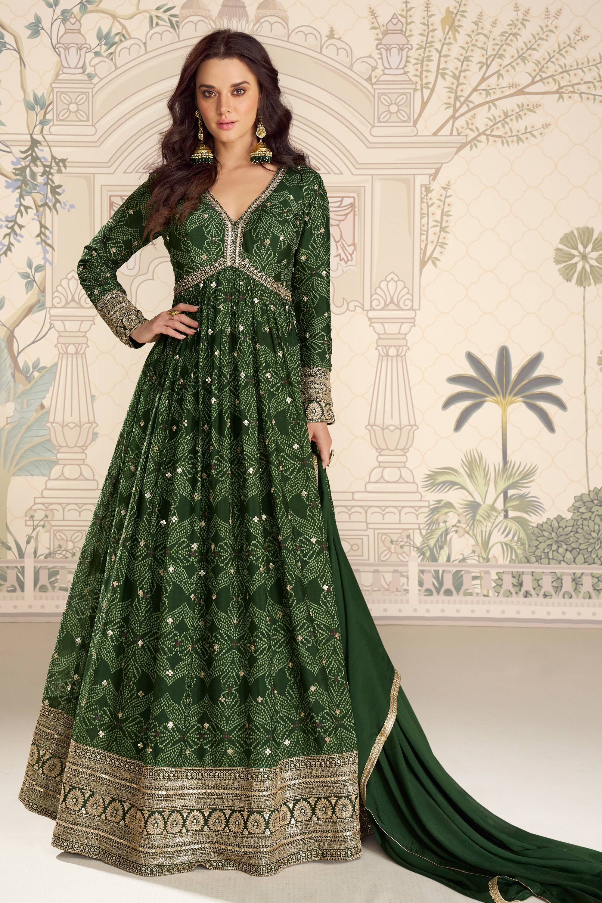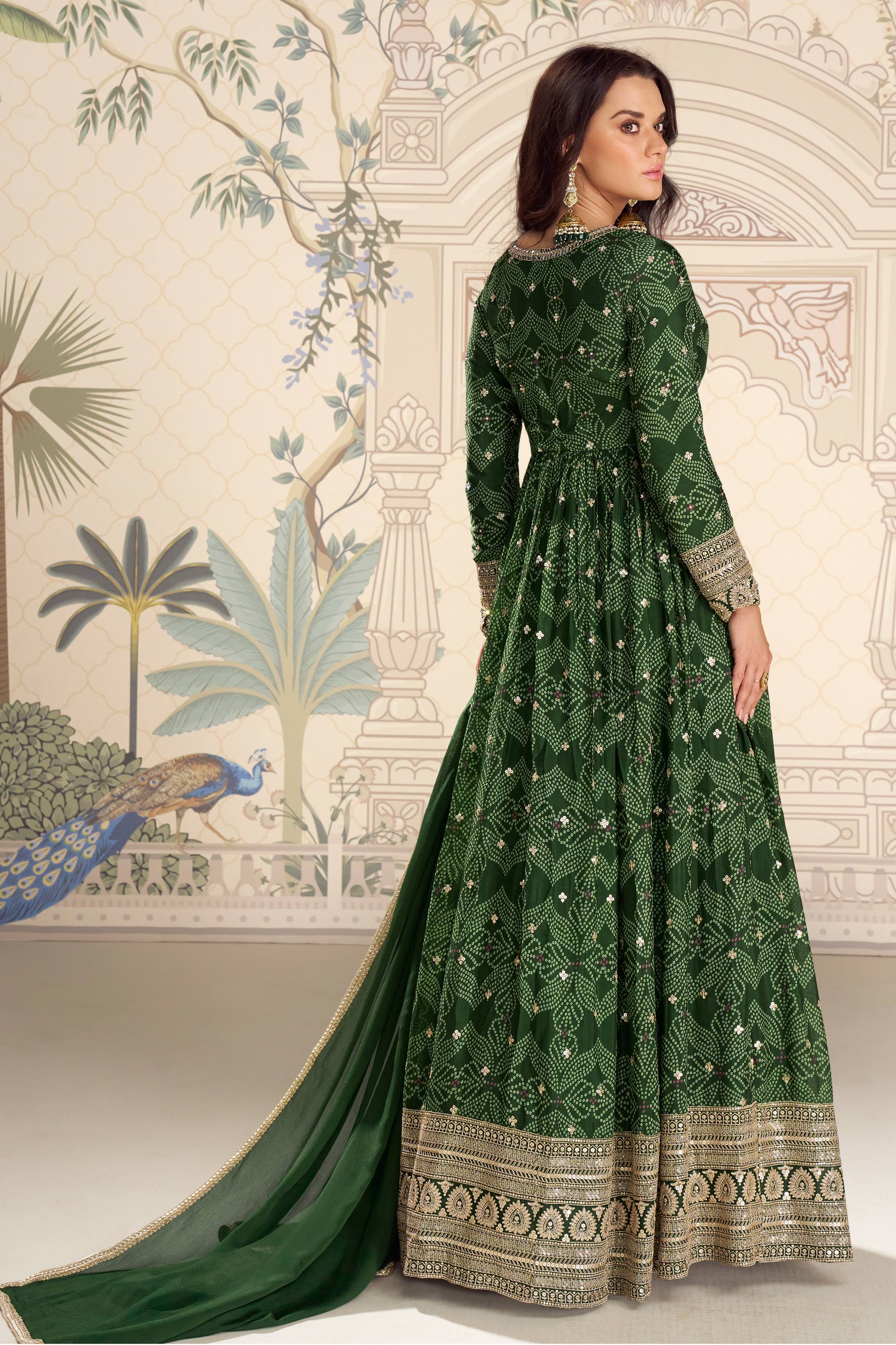 Chinon Silk Fabric Dark Green Bandhani Shaded Gown With Dupatta For Party Wear