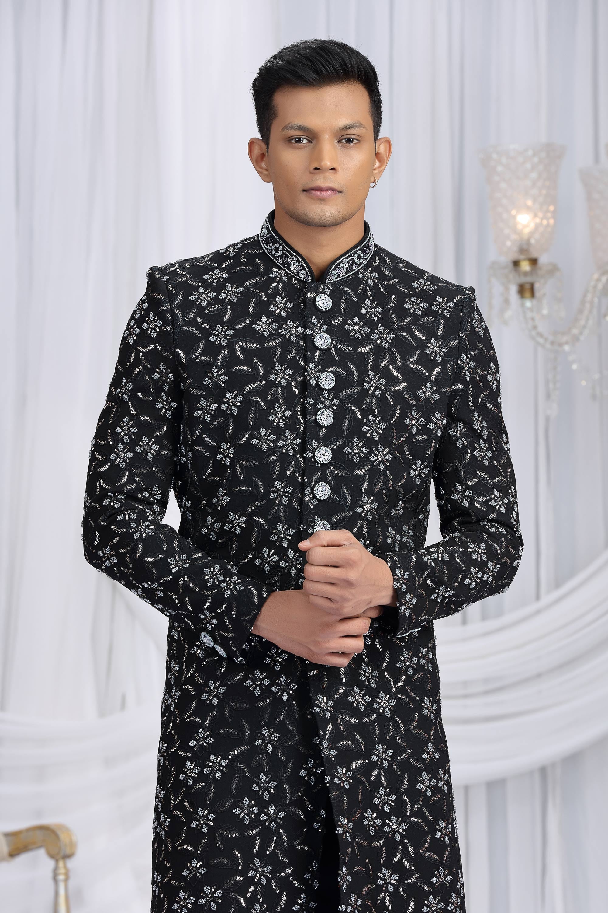 Embroidery Work Black Wedding Wear Indo Western For Men